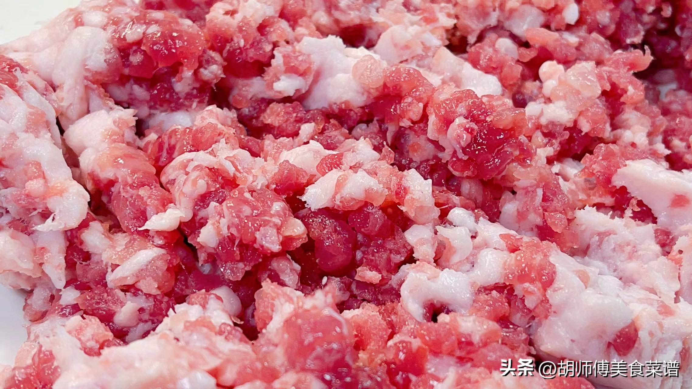 第二步:將前夾肉沖洗乾淨,然後把前夾肉切成片後,接着不斷的剁前夾肉,直到將肉剁成綠豆大小的顆粒即可。肉不能剁的太小了,否則會導致前夾肉喫着沒一點口感。