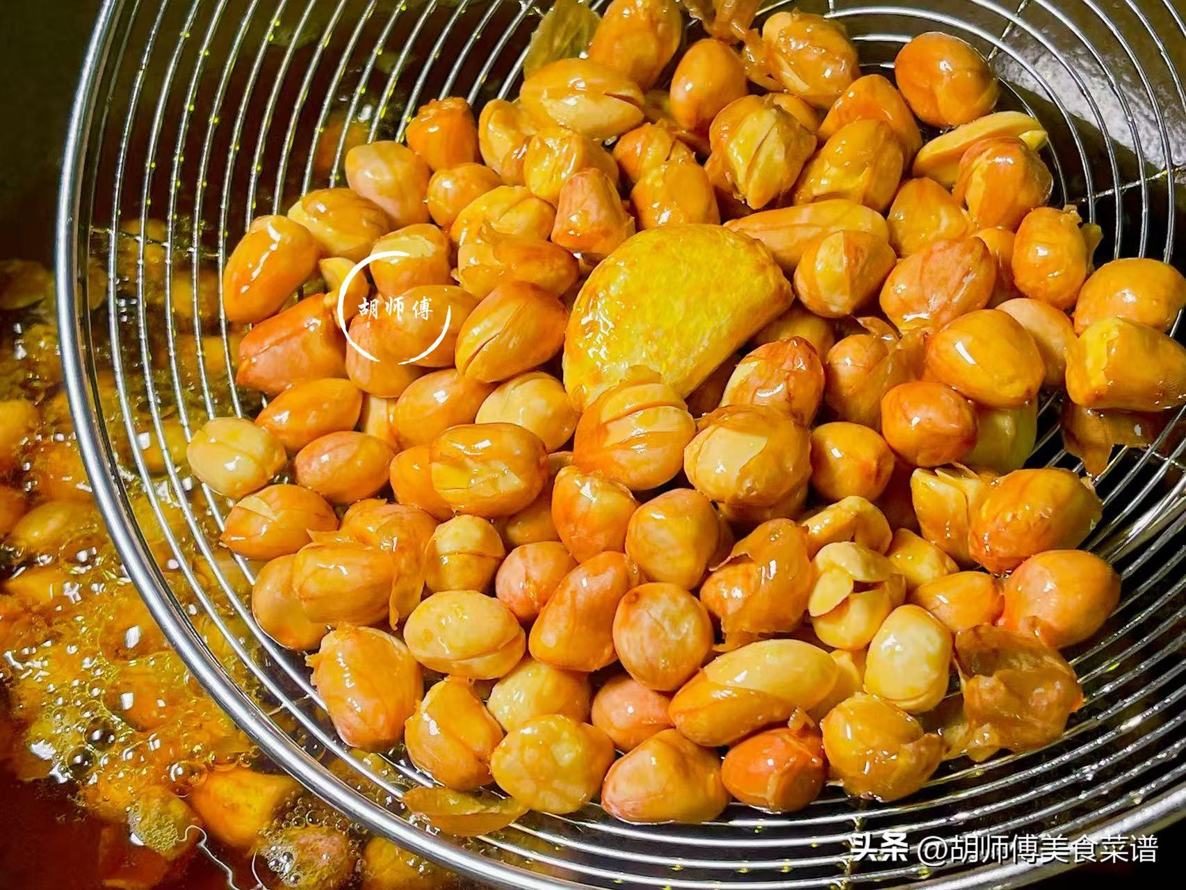 2、如何判斷花生炸好後,只需要放一顆蒜到鍋中,如果蒜外表呈現爲焦黃色,此時花生是剛剛熟的狀態,喫着是最香的,如果還炸一會兒,花生喫着就有糊味了。