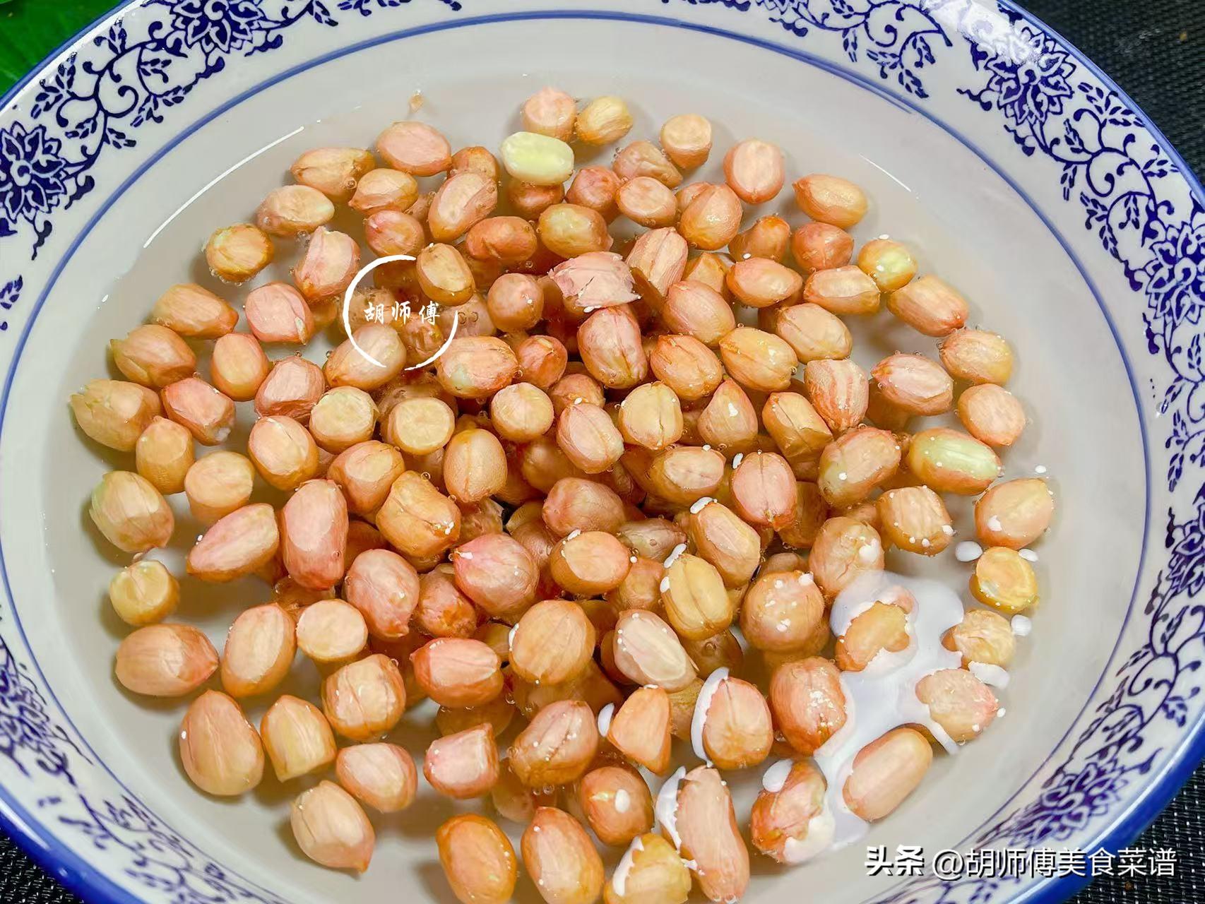 第一步:買回家的花生,先將裏面發黑發黃的挑出來扔掉,這種花生喫到嘴裏,整個口腔都是噁心的感覺,然後把花生、小蘇打放入冷水中,將花生浸泡20分鐘後撈出,接着再把花生沖洗一遍,最後將花生表面水瀝乾即可備用。
