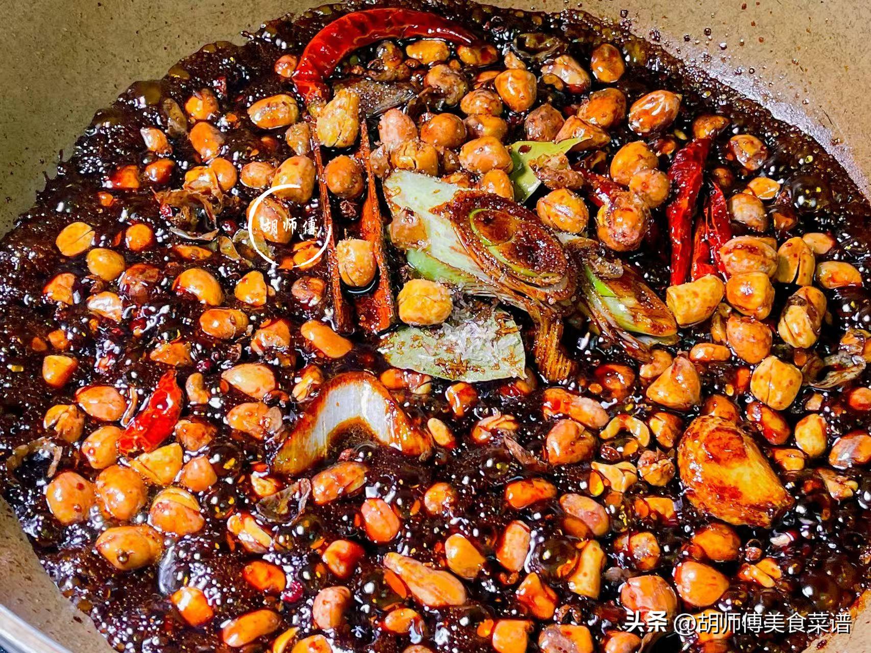 【食材準備】:大粒花生400克、幹辣椒10克、桂皮4克、花椒5克、大蔥20克、香葉3克、白砂糖100克、陳醋10ml、生抽20ml、老抽5ml。