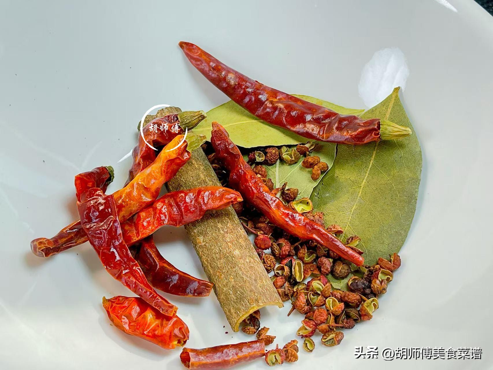 第二步:將桂皮、花椒、幹辣椒、香葉都用清水沖洗乾淨即可備用,喜歡喫辣的,可以多放一點辣椒。
