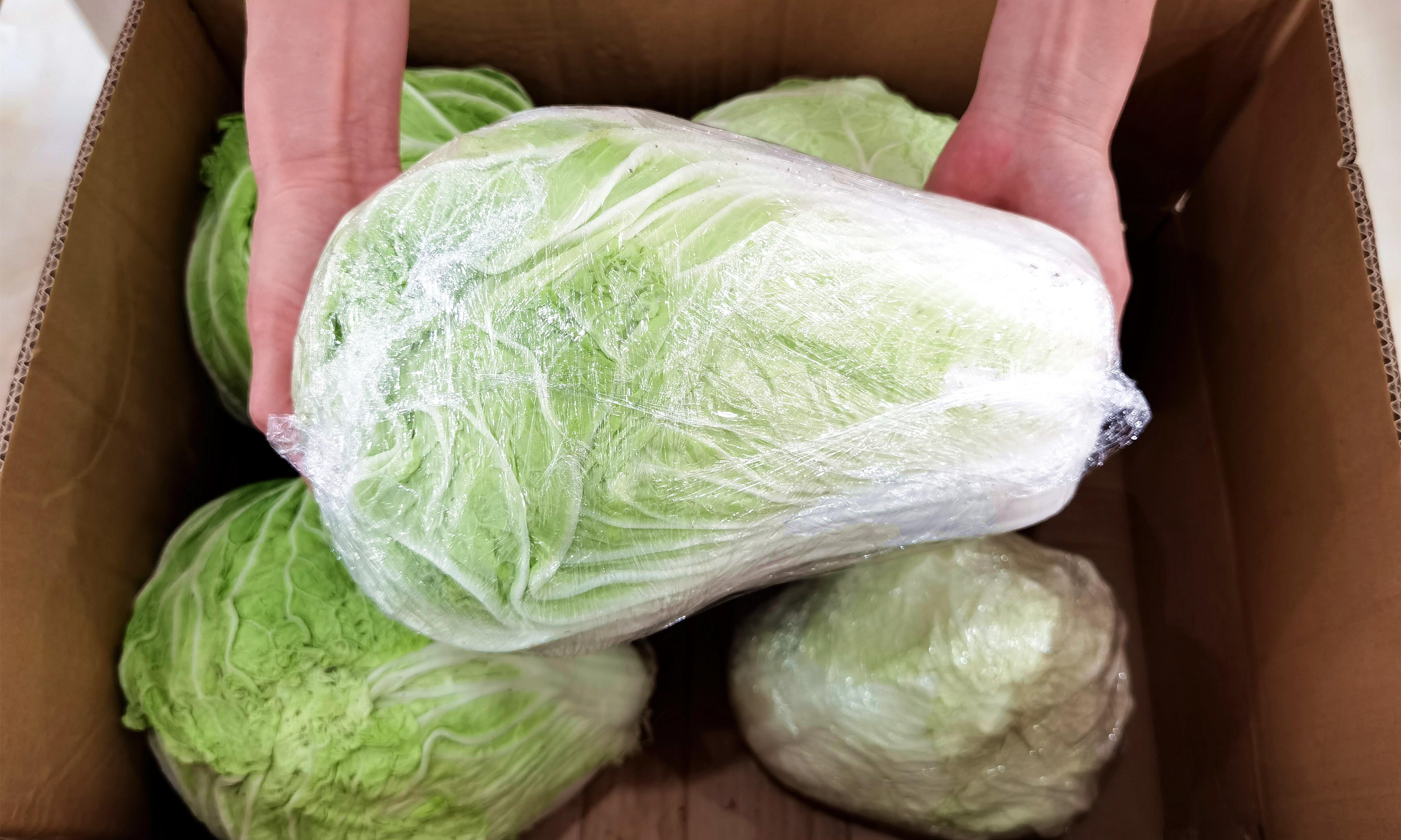 第四步:包裹豎放:用保鮮膜把整顆白菜緊緊地包裹起來,包裹時儘量排淨空氣,形成一種“真空”狀態。然後把包好的白菜根部朝下,豎着放進通風的紙箱裏。爲什麼非要根部朝下豎着放呢?因爲這符合白菜生長的自然狀態,它能感覺自己還“長”在地裏,這樣保存更不容易腐爛。