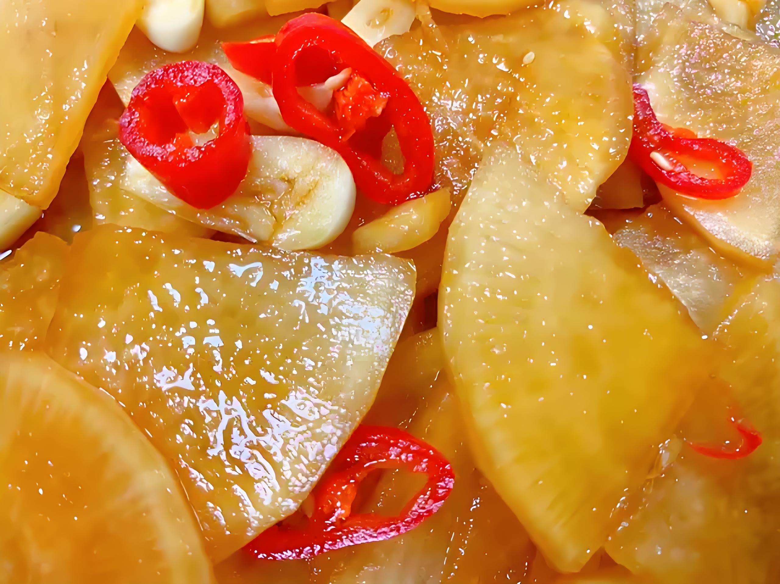 2. 爽口醃蘿蔔:早餐、解膩小能手。蘿蔔切薄片或小條,用鹽醃出水分後擠幹。鍋裏放生抽、糖、醋和適量清水煮開晾涼,倒入蘿蔔中,放幾個小米辣,密封冷藏一晚上。第二天就是酸甜脆爽的小菜啦!