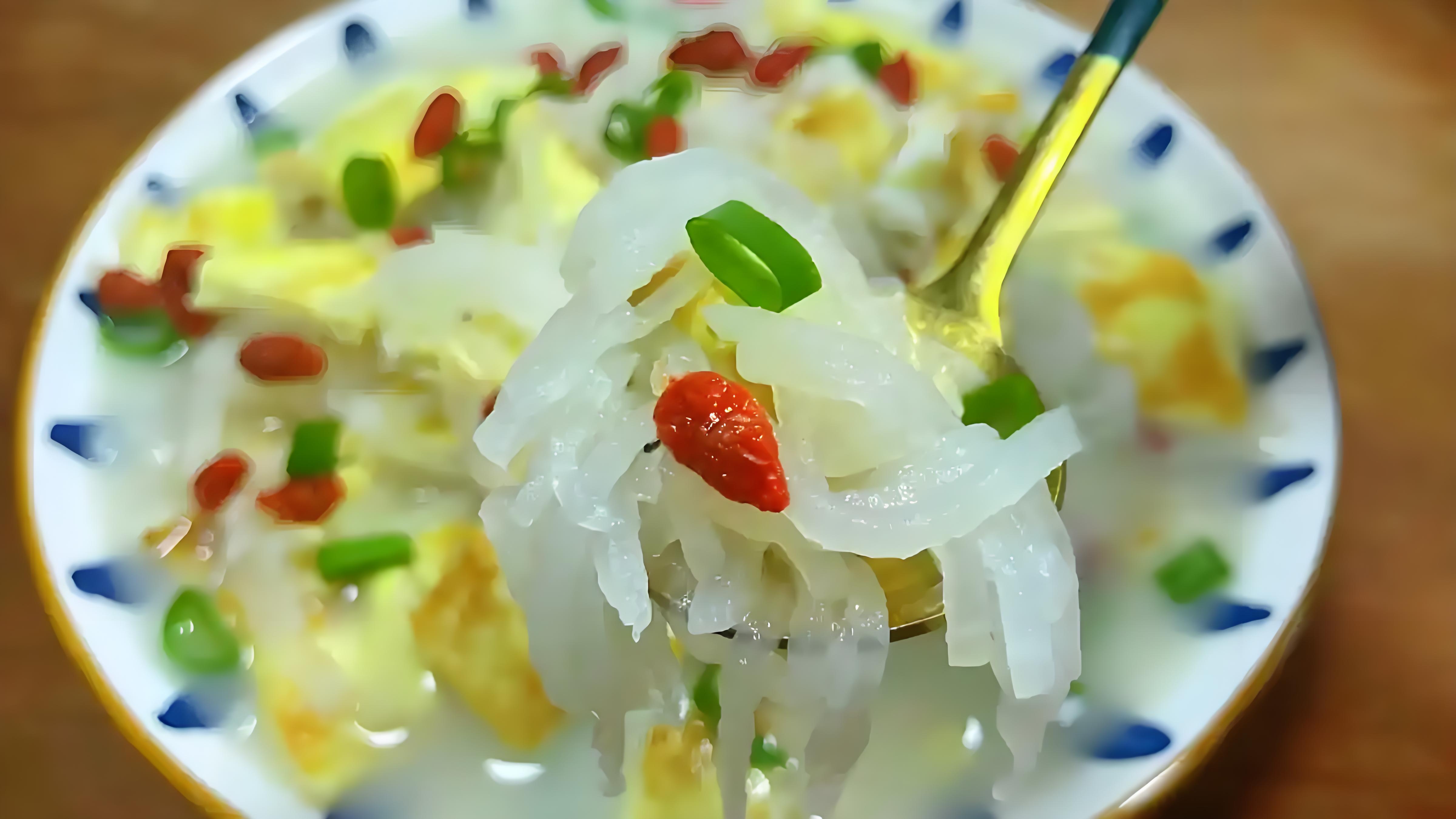 3. 加入足量的開水,大火煮開,轉中火煮5-6分鐘,直到蘿蔔絲變得透明軟爛。放入煎好的雞蛋和枸杞,再煮2分鐘。