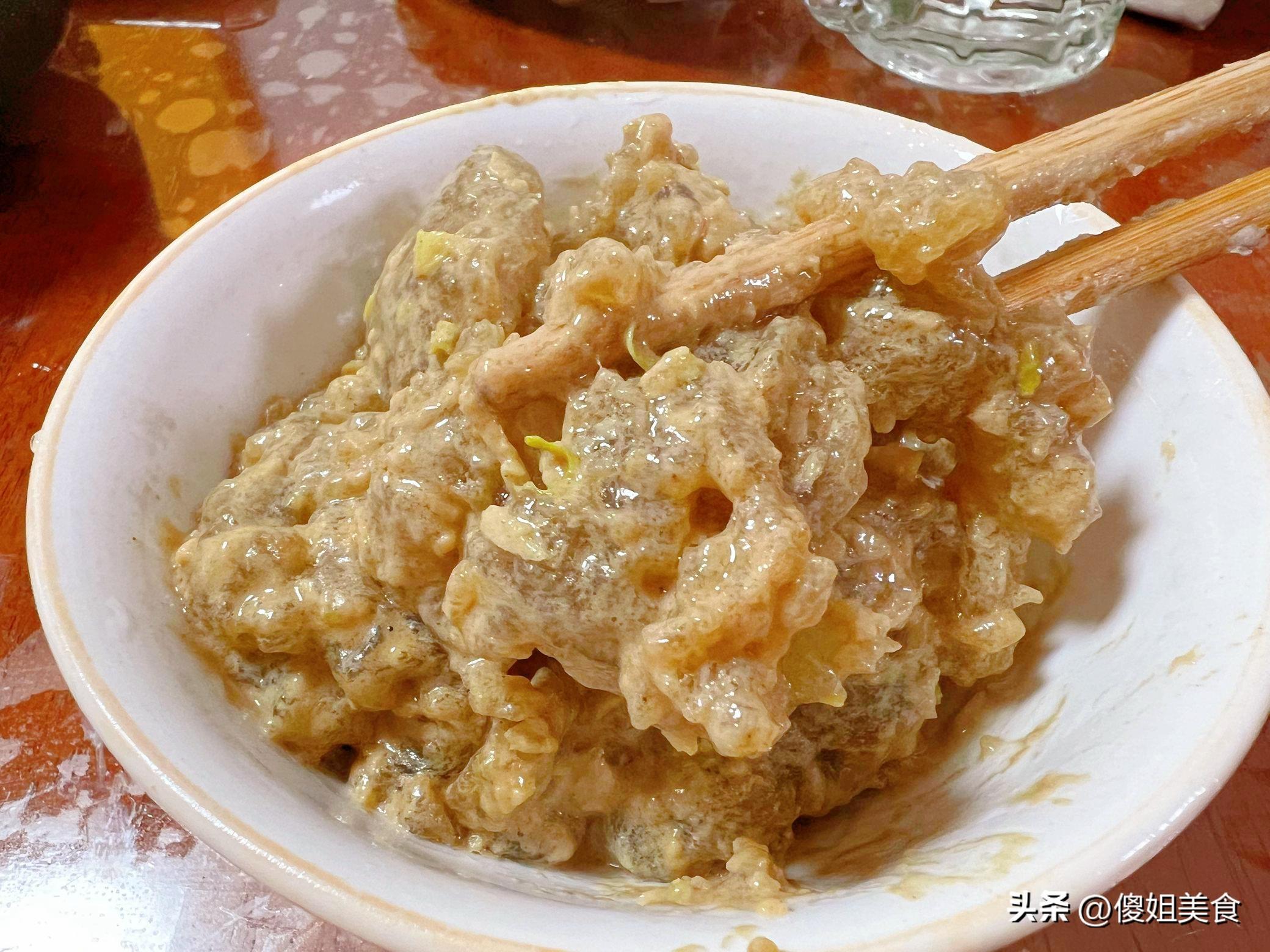 最靈魂的一步來了——調芝麻醬汁。挖幾勺芝麻醬,加溫水慢慢泄開,再來點蒜末、生抽和醋,攪拌均勻後往煎好的燜子上一澆……哎呦,我那不爭氣的口水啊。