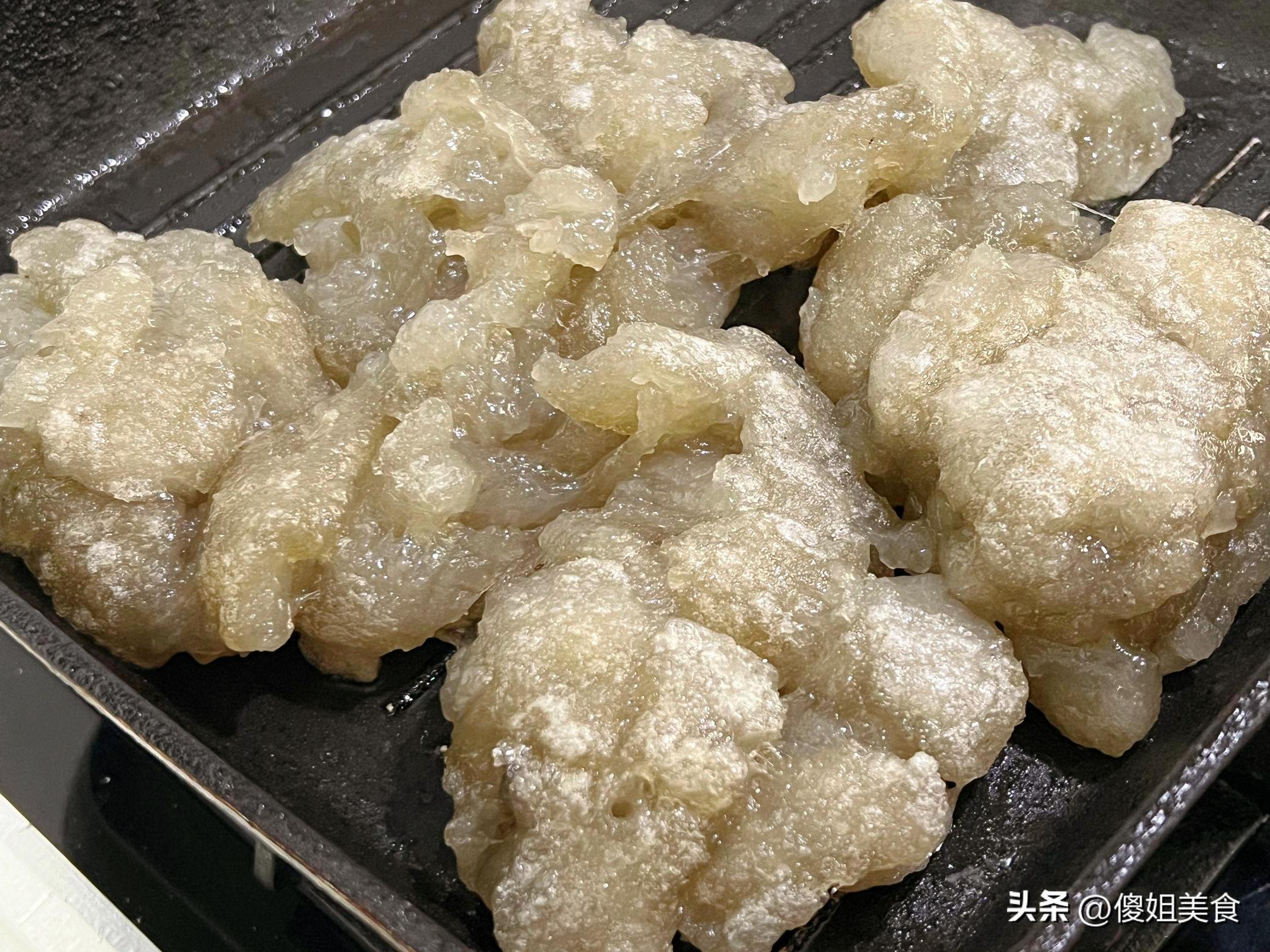 鍋裏刷層油,不用多,薄薄一層就行,把調好的紅薯澱粉液倒進去,小火慢慢煎,等着它從白色變成透明,一面定型了再翻個面,等到整塊都變得晶瑩剔透,跟塊大水晶似的,就可以出鍋了。