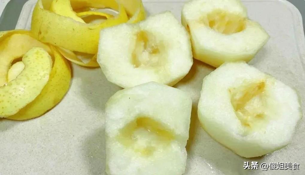 【具體做法】選雪梨的時候,我喜歡挑那種形狀勻稱、拿在手裏沉甸甸的,這樣的梨水分足,口感好。處理雪梨的時候有個小竅門要告訴大家——削皮的時候儘量小心,別把梨皮削斷了。爲什麼呢?因爲梨皮留着後面還有用處呢,它能讓煮出來的梨顏色更加漂亮。梨皮削好後,再把梨核去掉,這樣煮的時候更容易入味。