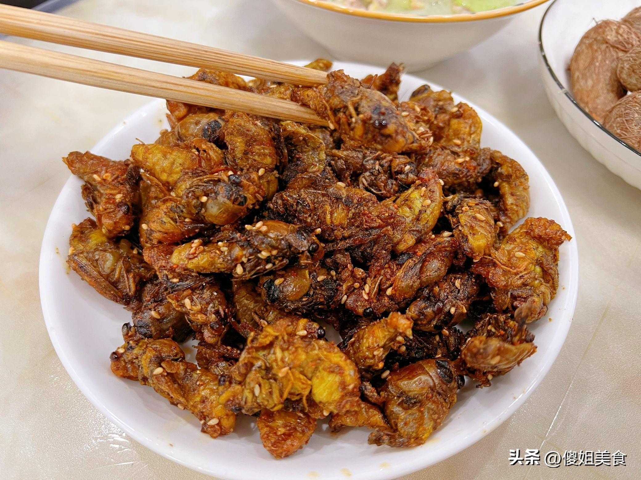 先來說說這道炸金蟬吧,其實我也知道,有些人可能不太敢喫這個,但我特別愛喫,今天突然想喫了,正好冰箱裏還有瓶冷凍的,這是夏天回老家抓的,拿出來化凍,清洗乾淨,控幹水分。
