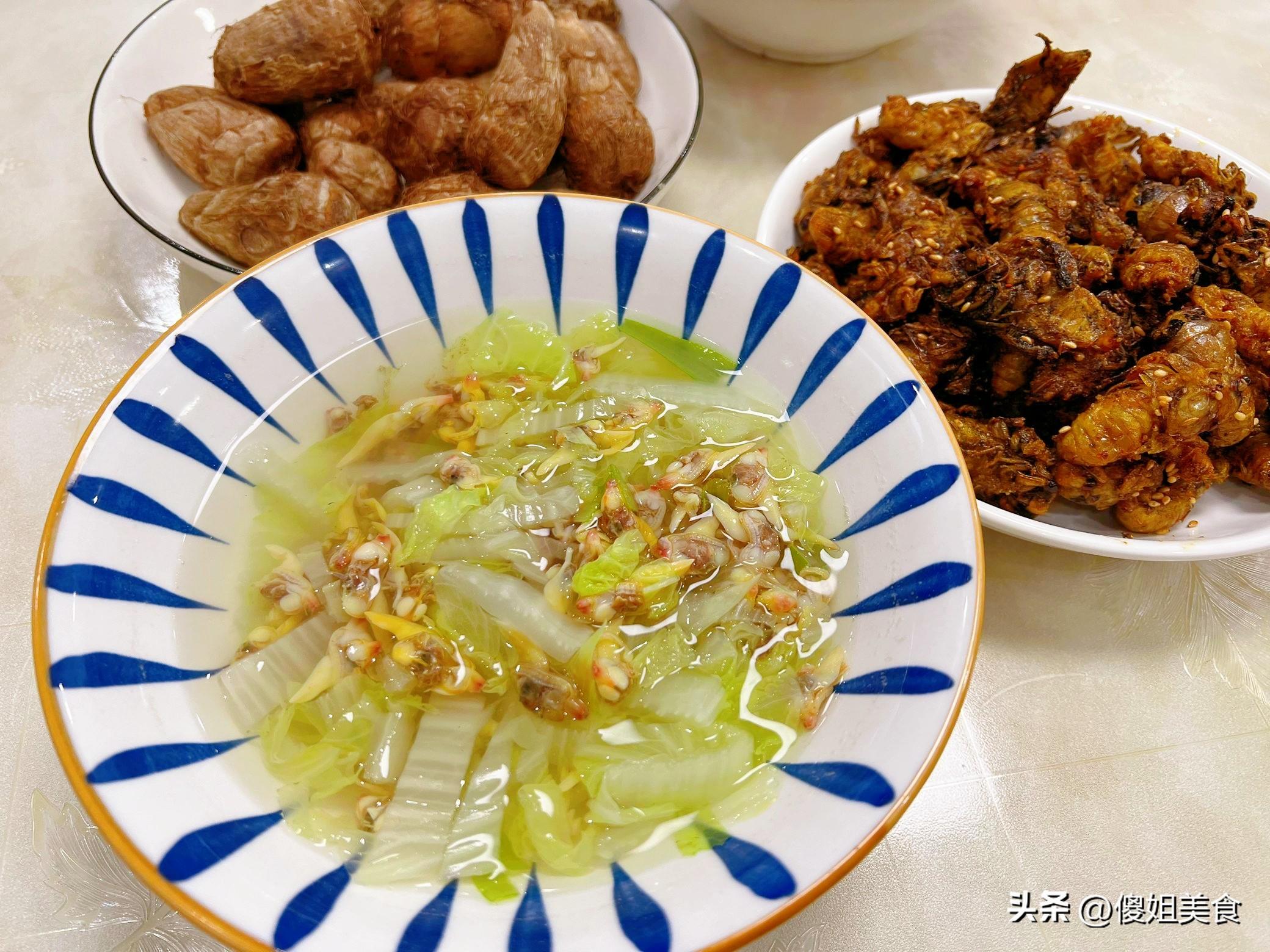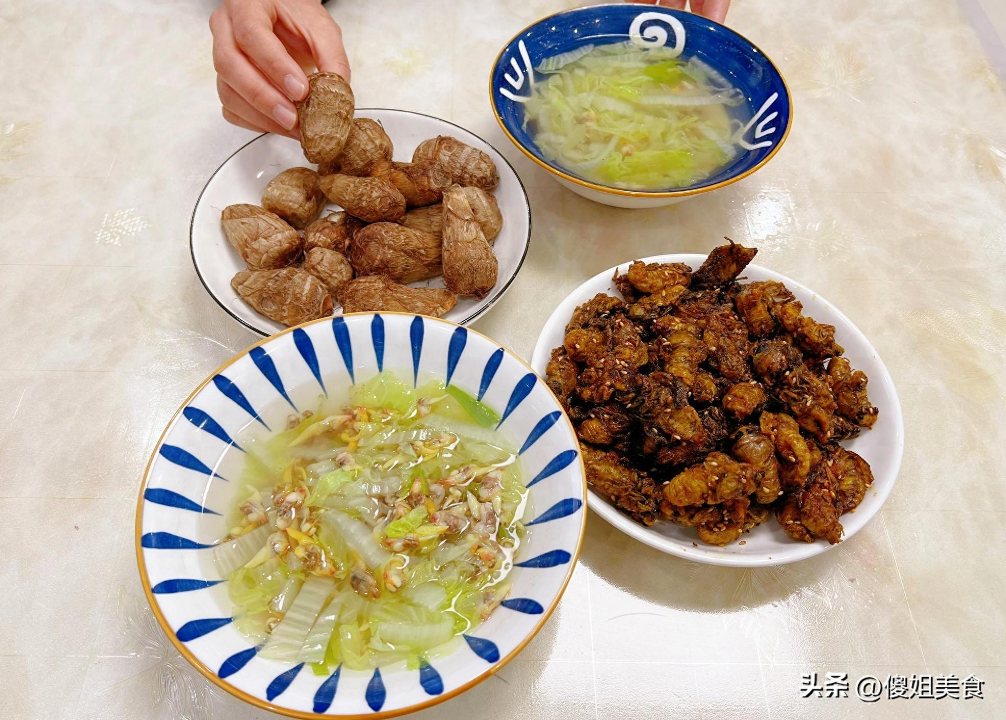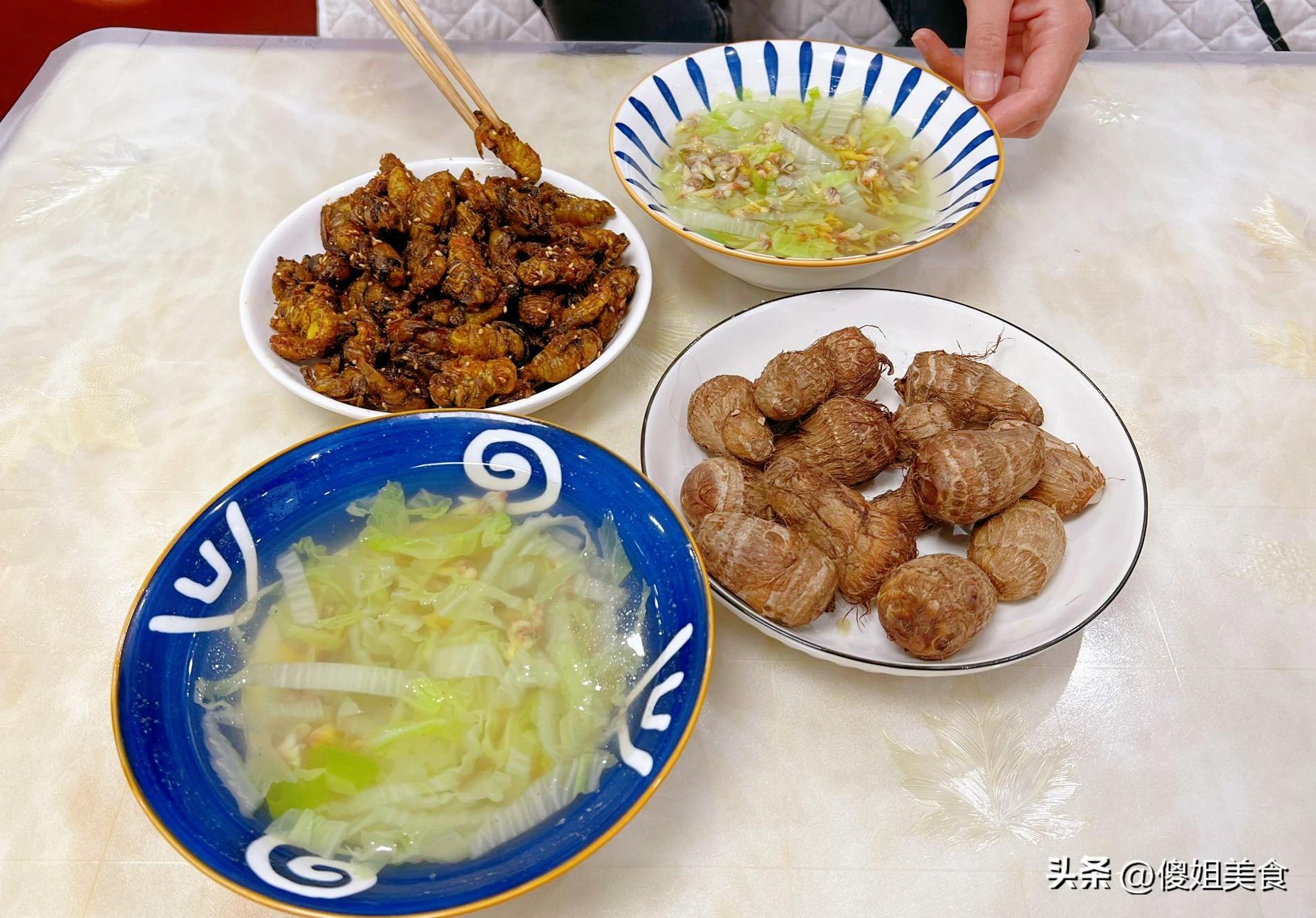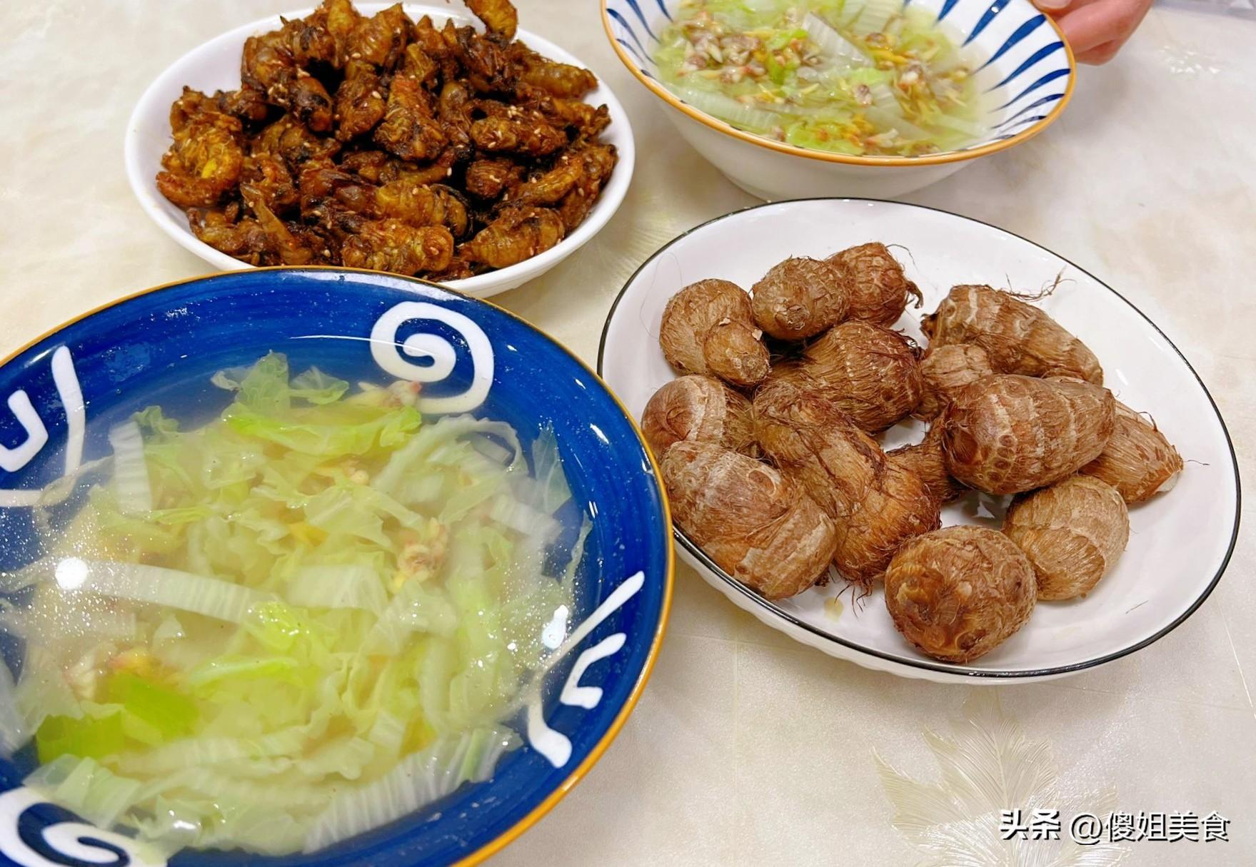 一起來看看我家的晚餐吧,今晚就做了兩道菜,一道炸金蟬,一道白菜花甲湯,還有個蒸芋頭當主食。