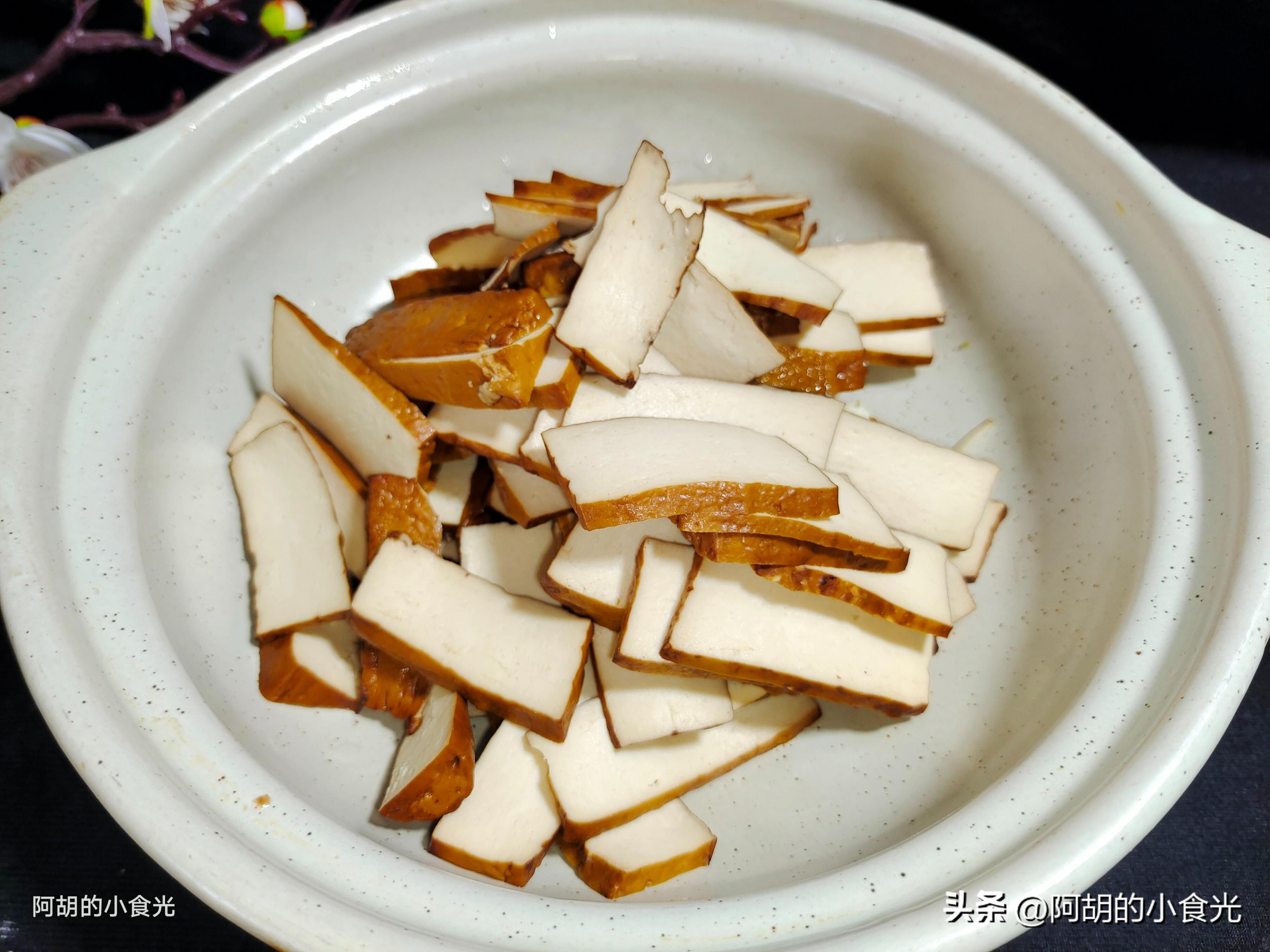 第一步:先來準備4塊厚香乾,簡單清洗後直接切成片放入碗中備用。這種厚厚的香乾口感更鮮嫩一些,找不到的也可以用那種白色的豆乾來代替。