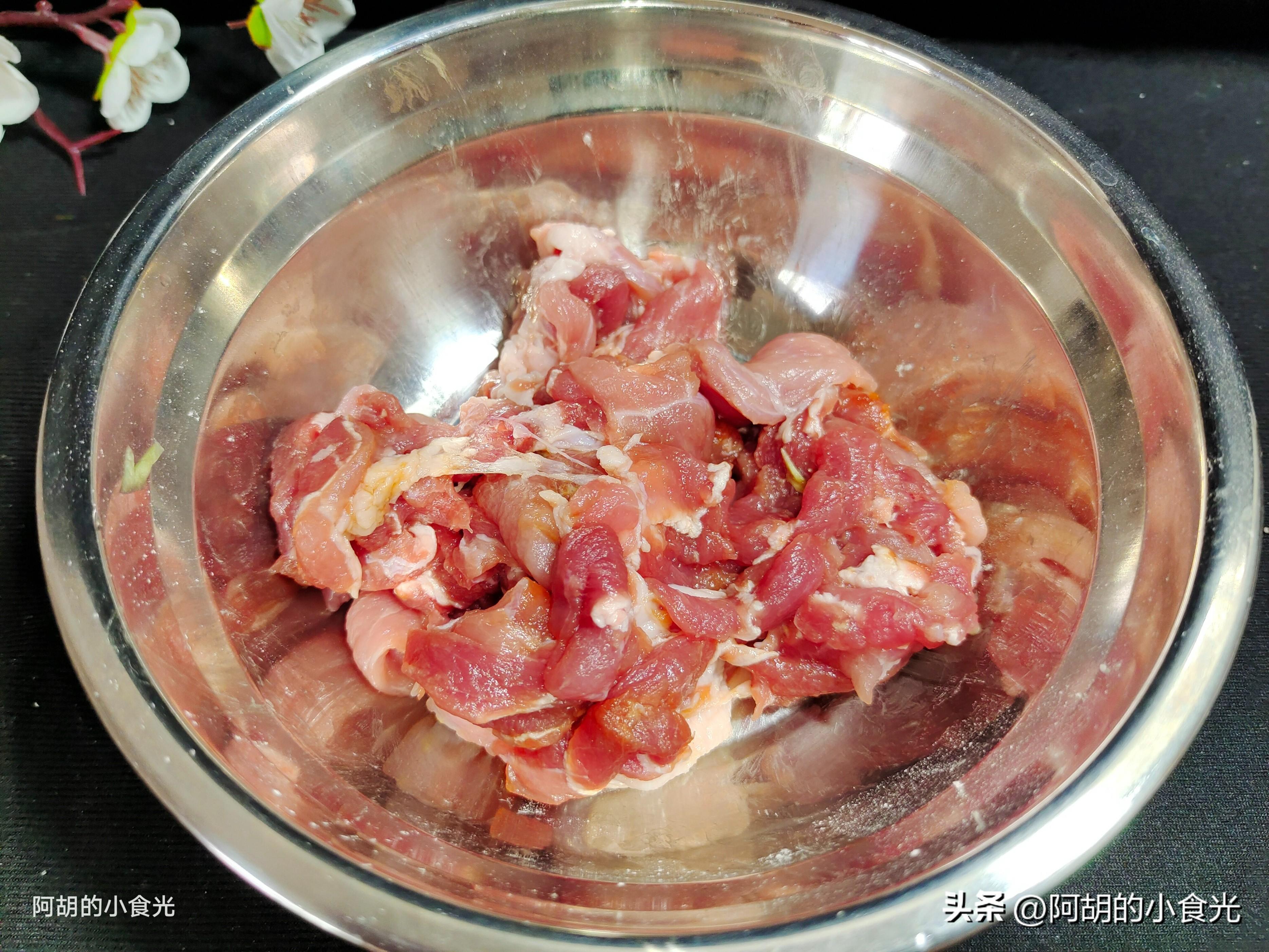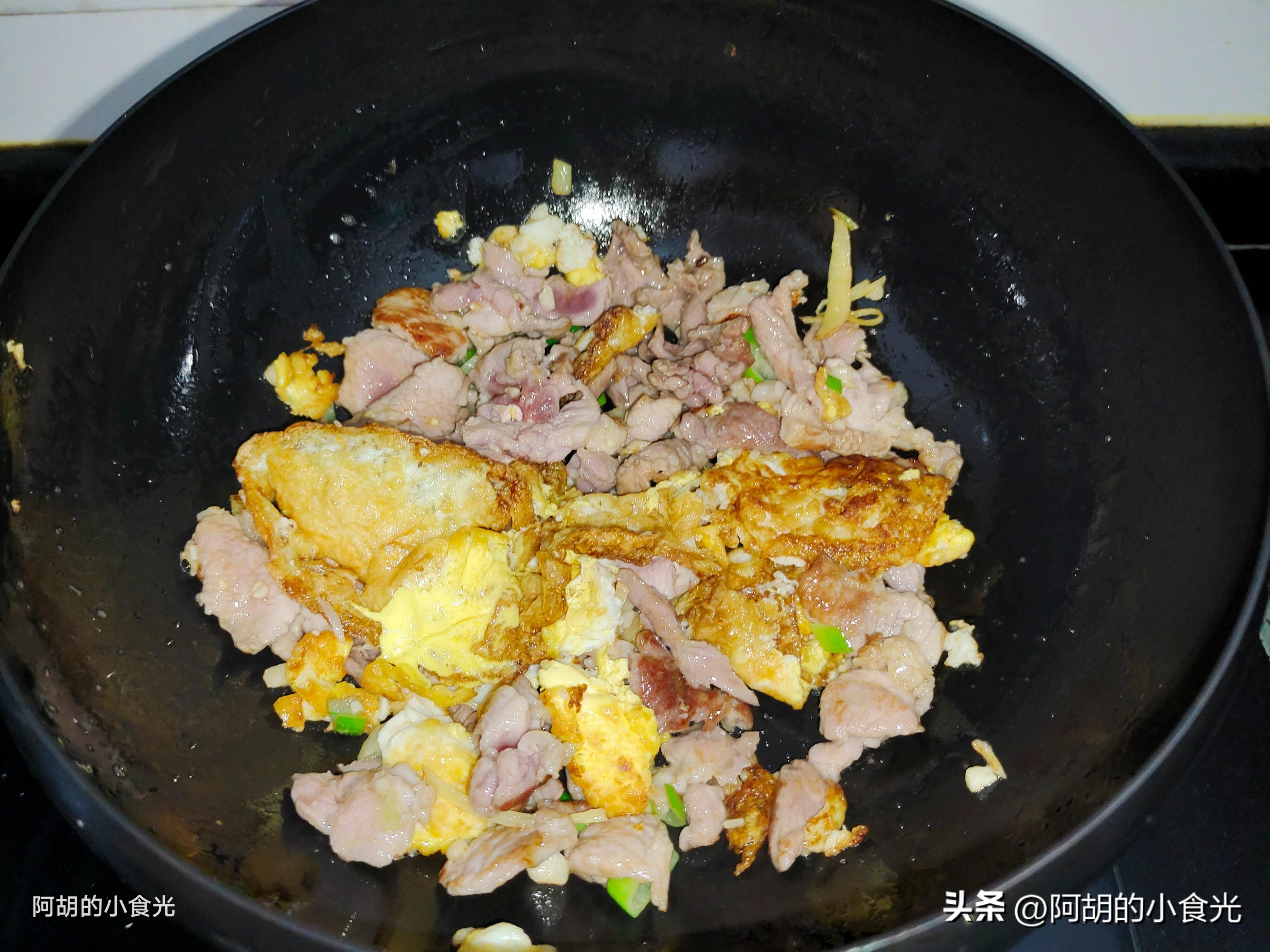 這道菜煎雞蛋的時候可以稍微多一些的菜籽油,因爲雞蛋煎好後還要炒一炒肉片。肉片儘量使用“梅頭肉”部位,這樣一炒一煮還能保持其比較好的鮮嫩口感。