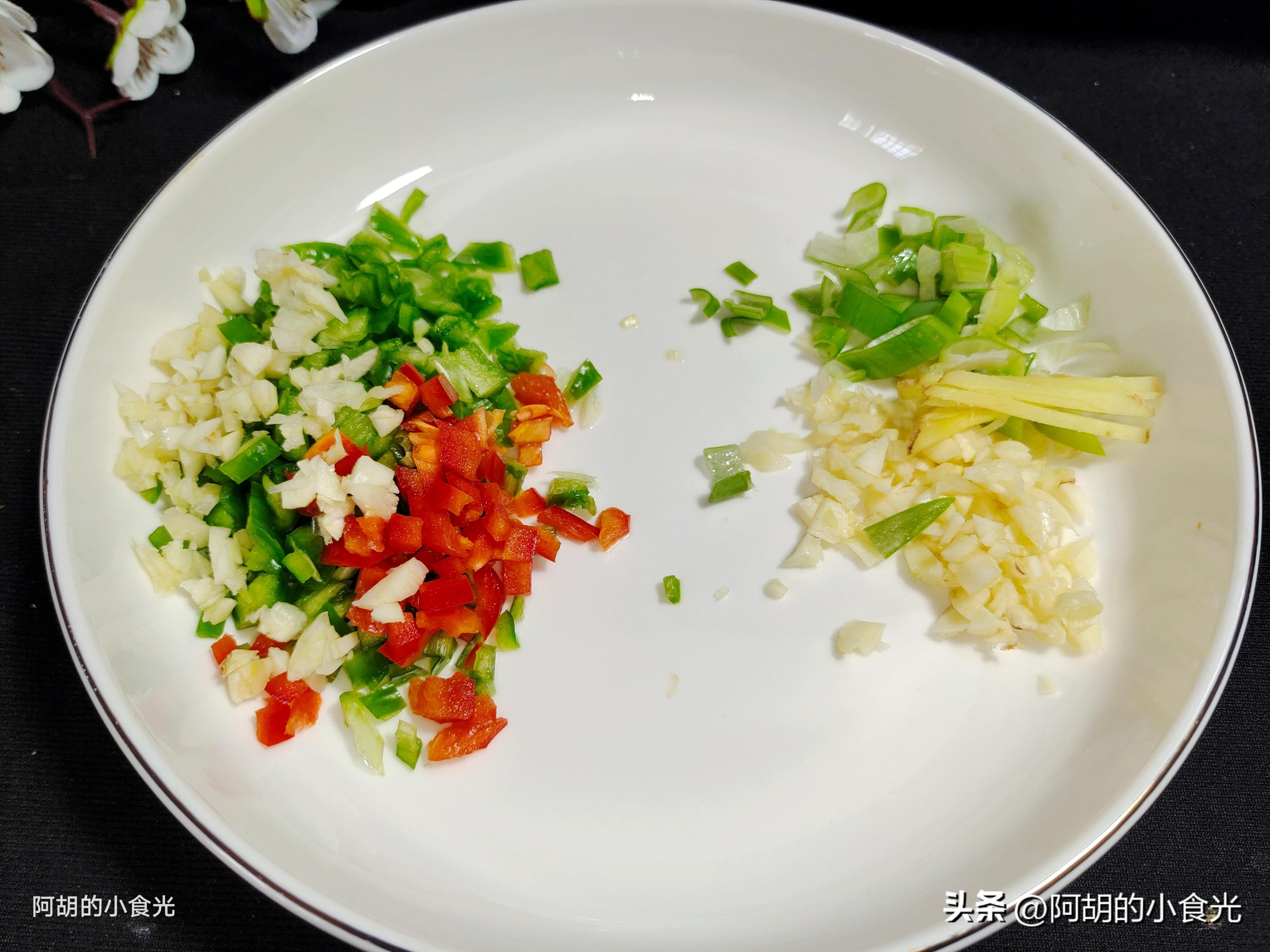 第二步:準備的配菜有青紅椒適量切碎備用,再來一些蔥薑蒜末作爲小料使用,喜歡辣味的可以搭配紅小米椒碎,我這裏後面就用了一些幹辣椒粉來增添一些微辣的味道,還有兩個雞蛋也要備好。再準備豬梅頭瘦肉一小塊,直接切片後放入碗中,撒入少許食鹽,雞精和生抽充分地抓勻,再來少許的幹澱粉抓勻置於一邊醃製幾分鐘。