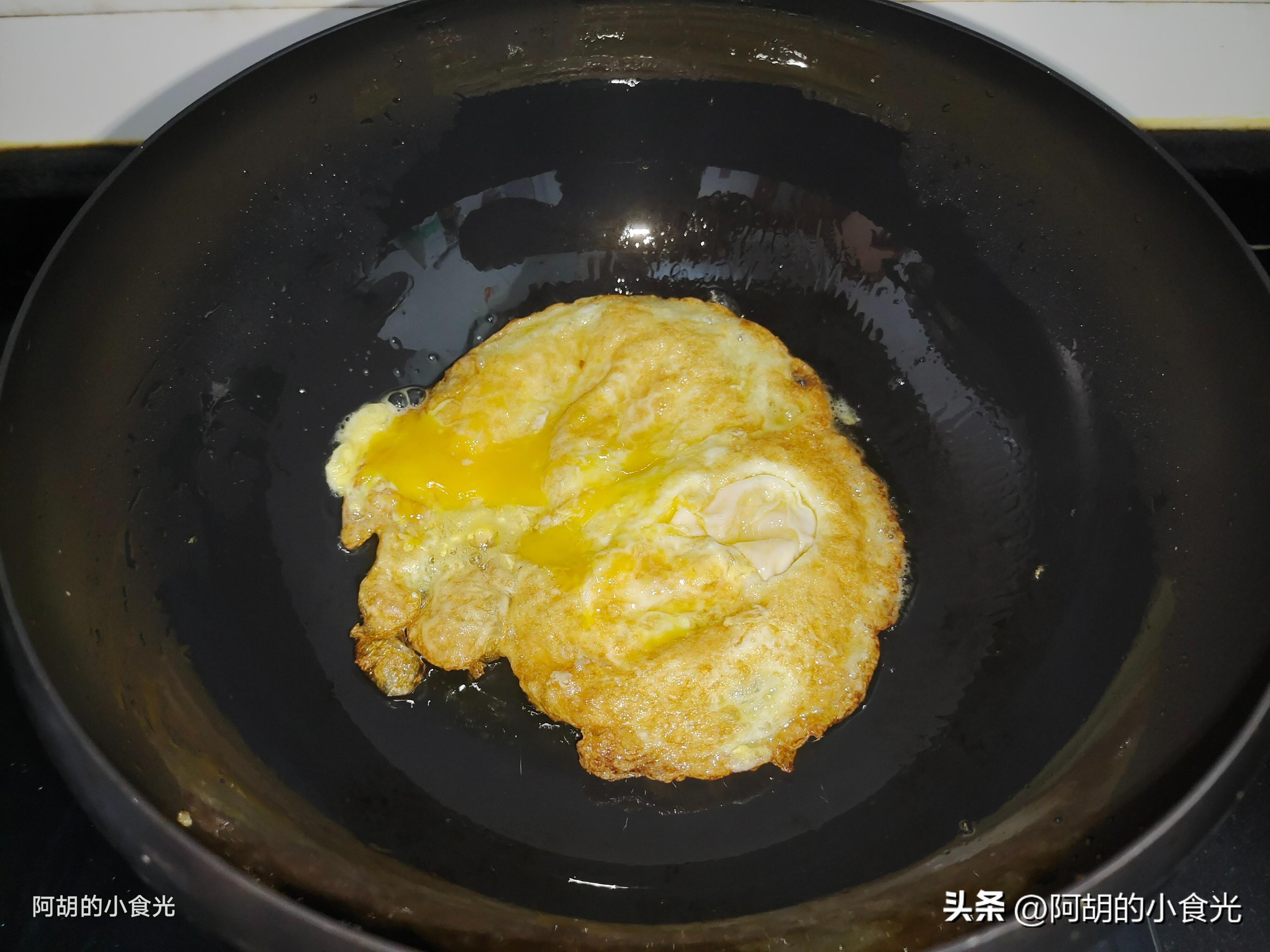 第三步:所有主要的食材都準備好,下面就來開火烹飪。先小火把鍋烘乾,淋入一些菜籽油燒熱,而後直接打入兩個雞蛋煎一煎,煎好一面再翻面煎一煎,煎成荷包蛋即可。而後用鏟子把荷包蛋切開成大塊。