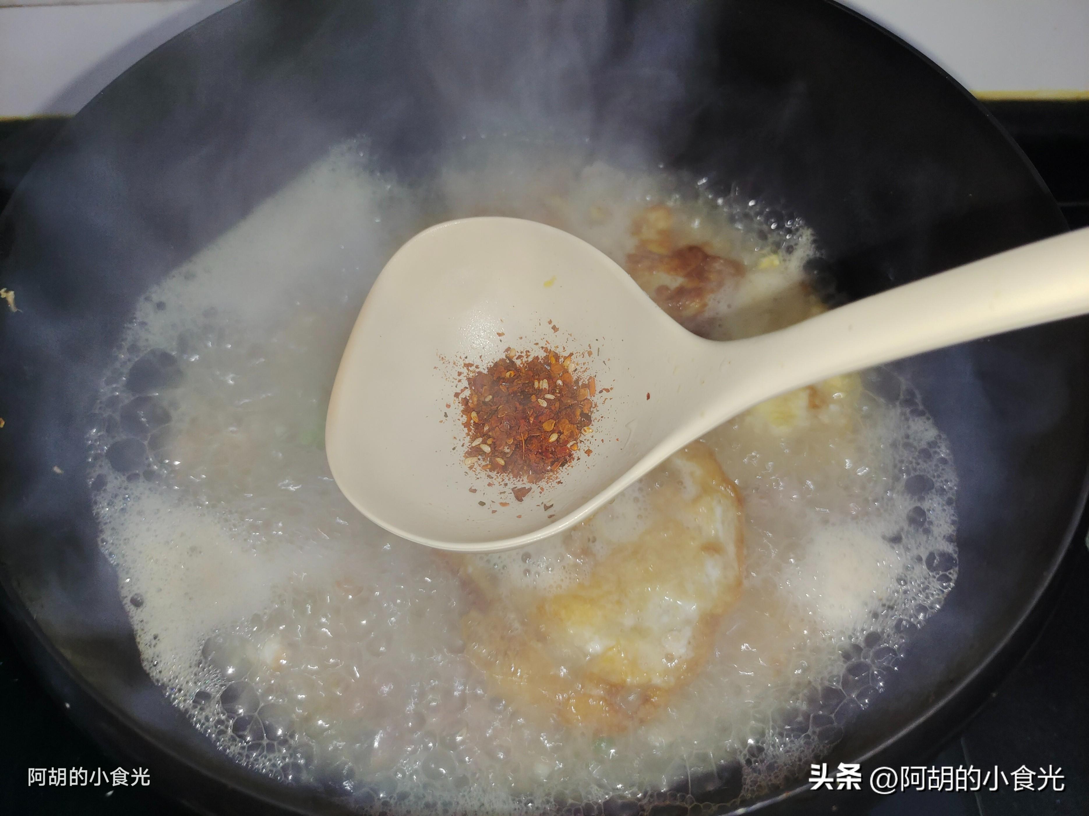 第五步:準備一些開水直接衝入鍋中,轉爲大火煮開。此時可以淋入少許的生抽和辣椒粉一塊煮一煮。再把香乾片也倒入鍋中,撒入食鹽,雞精和適量胡椒粉調味。