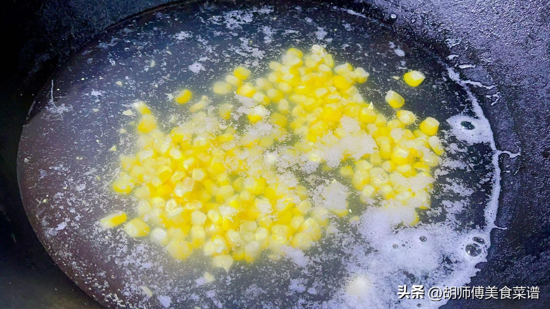 第一步:鍋中放入適量水,然後把玉米粒倒入鍋中,大火煮5分鐘左右,直到將玉米粒煮熟。