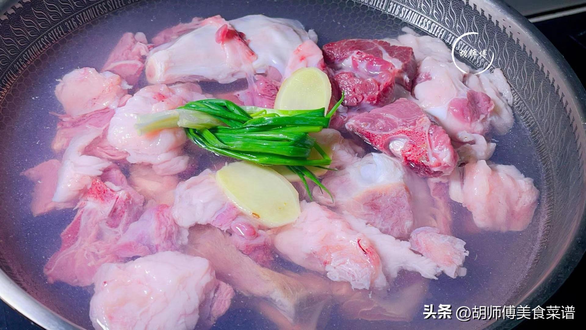 第一步:將羊腿肉、羊肉、蔥段全部都放入鍋中,同時加入適量冷水,將它們焯水15分鐘後撈出,然後用清水將表面的浮沫沖洗乾淨。