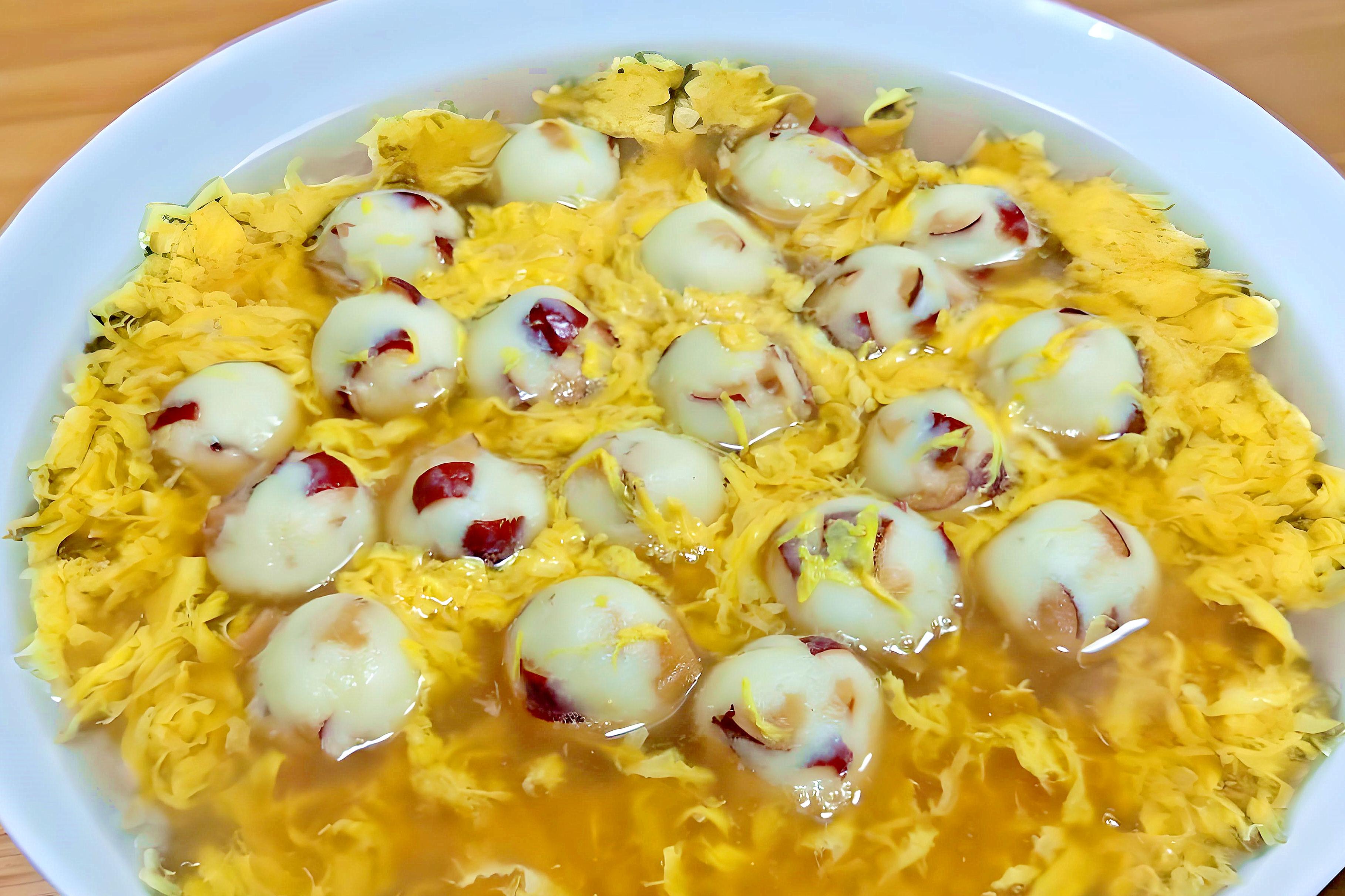 這第一道,是個討喜的甜湯,山藥做的小圓子軟糯糯的,配上紅糖和蛋花,暖身又暖心。