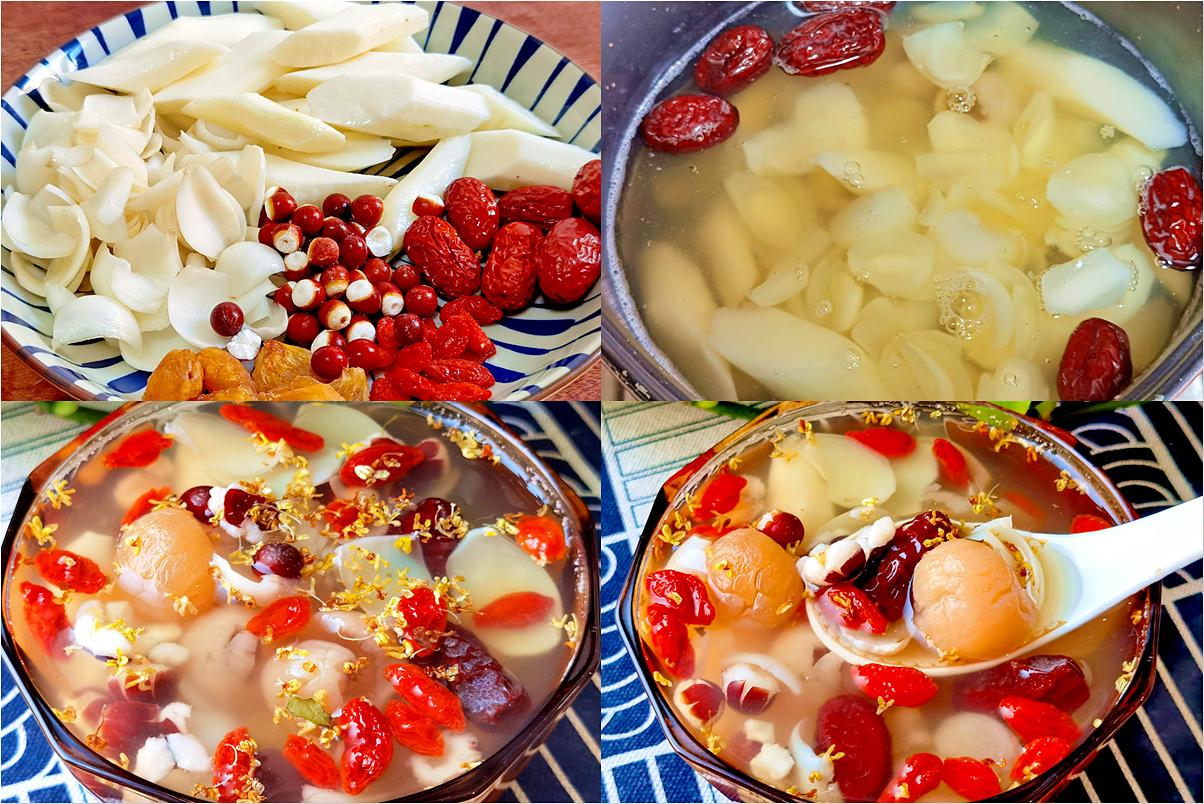 3. 加入足量的清水,大火燒開後,轉成小火,慢慢熬上30-40分鐘,直到所有食材的滋味都融到湯裏,口感軟糯。關火後,撒上一小把幹桂花,香氣“噌”地一下就出來了!
