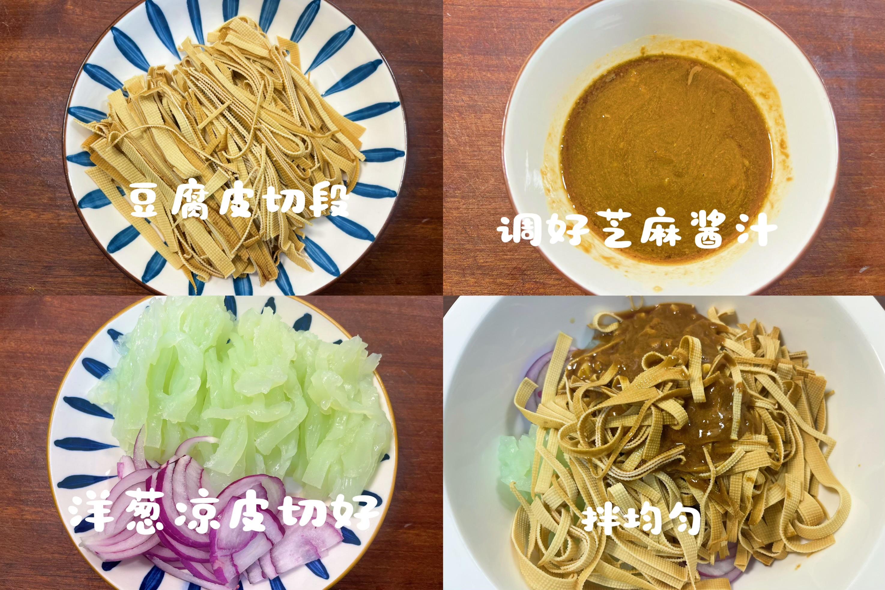 1. 洋蔥切絲(如果怕辣,可以放冰水裏泡10分鐘,能減輕辣味)。豆腐皮用開水燙一下,切絲。再準備點黃瓜絲和蒜末。