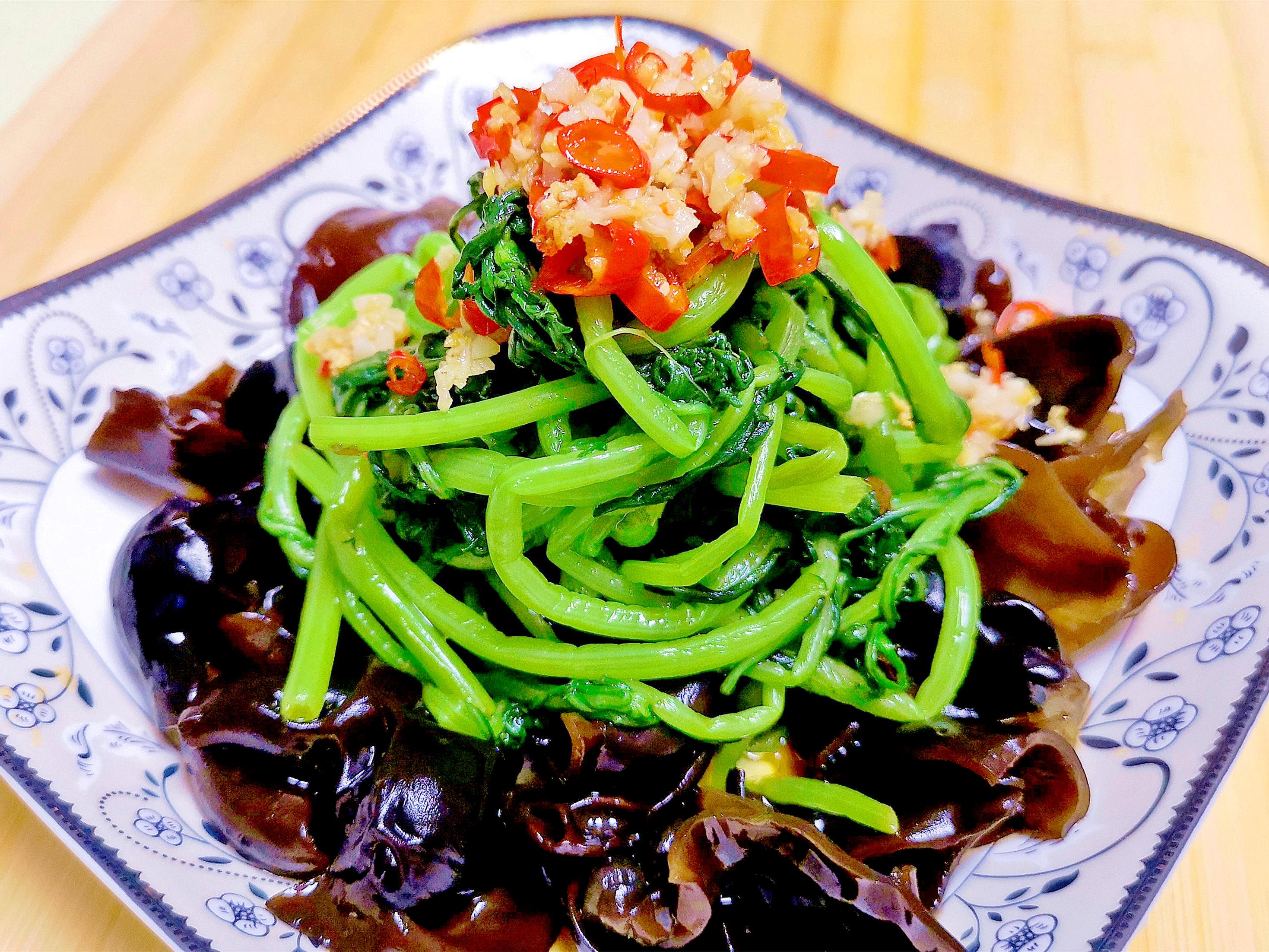 這道菜口感超級豐富!茼蒿的清香、木耳的脆爽,加上蒜蓉小米辣的微辣辛香,喫起來特別過癮。它能很好地刺激食慾,促進消化,而且低脂健康,當作開胃小菜或者下酒小菜都再合適不過了。