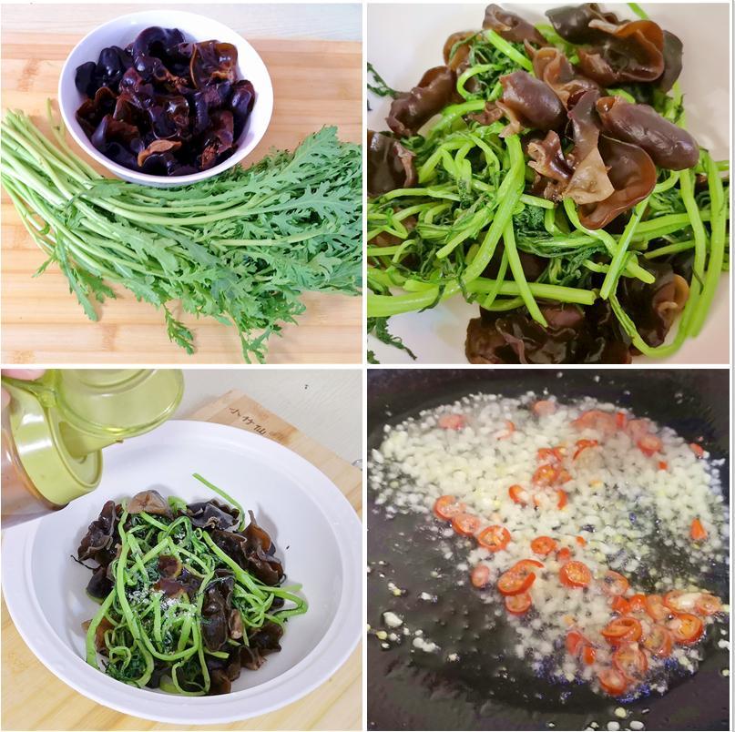 1. 茼蒿洗淨,焯水。鍋裏水開,加幾滴油和一點鹽,先把泡發好的黑木耳放進去煮兩分鐘,再下入茼蒿,燙個20-30秒,顏色變翠綠立刻撈出。