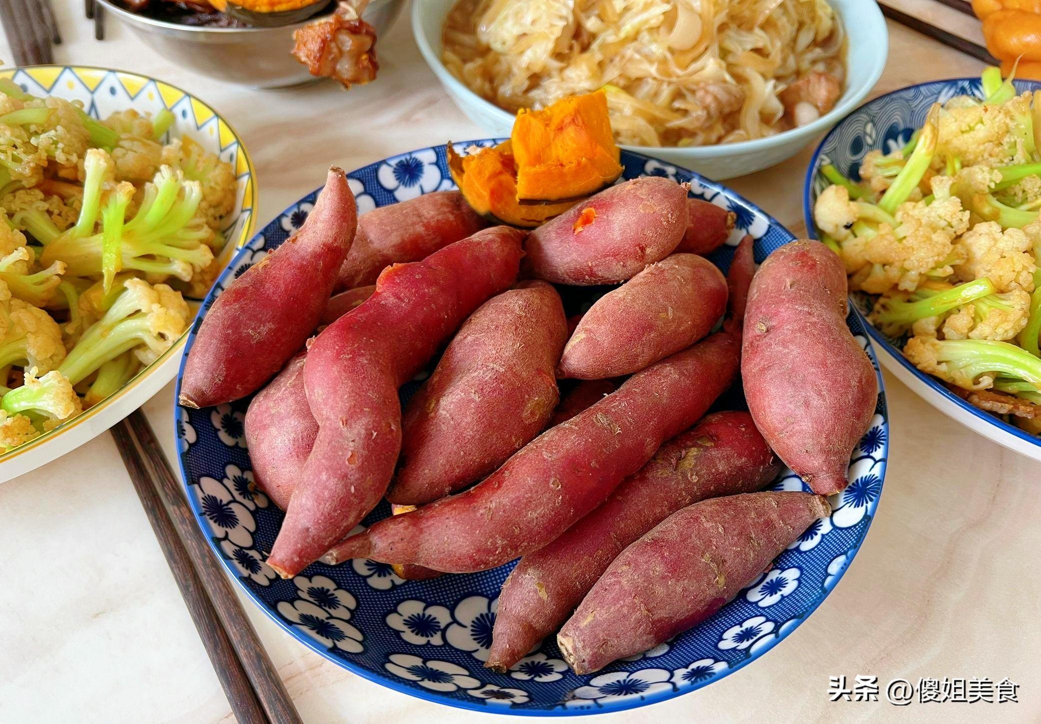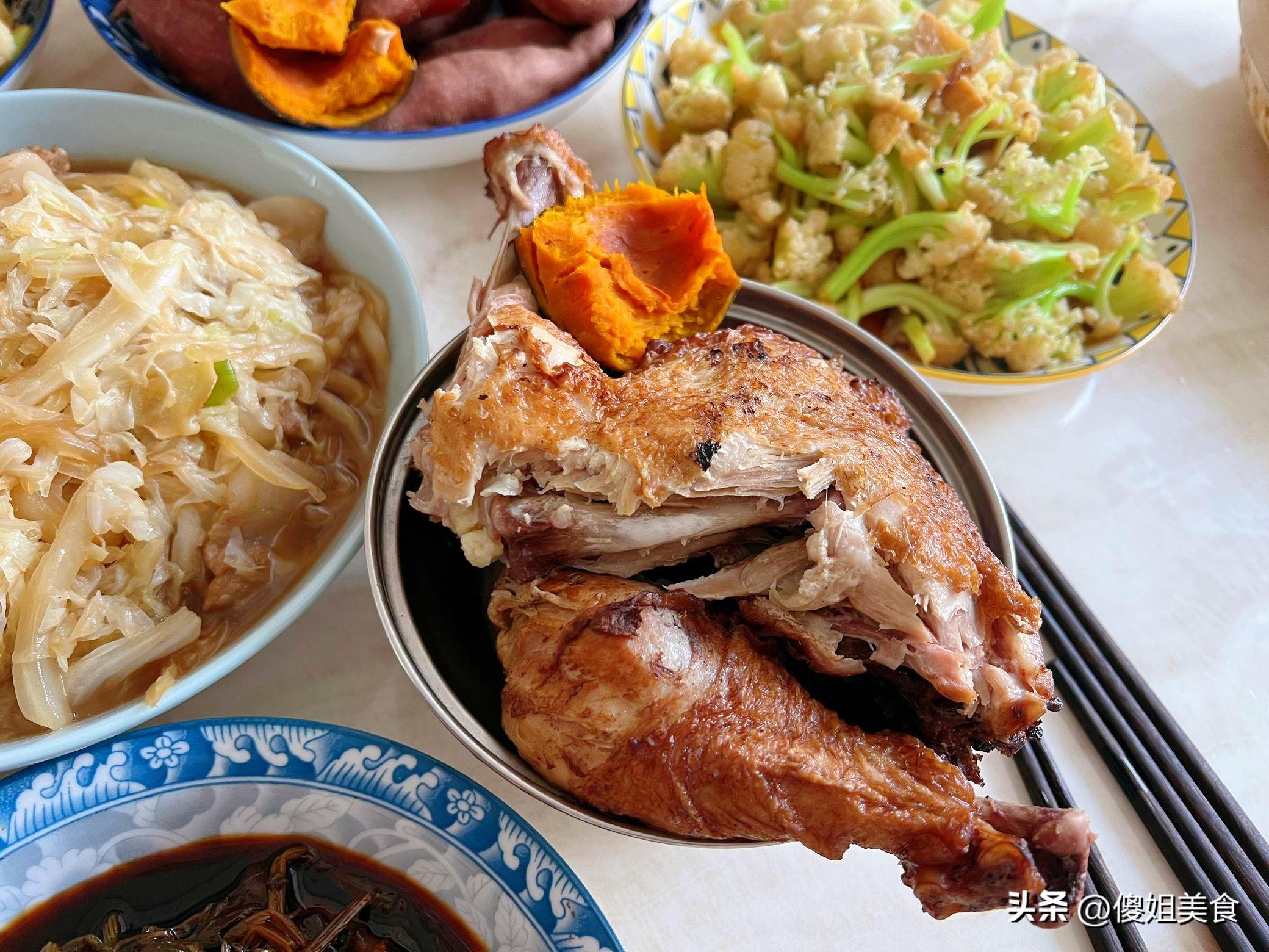 燒雞是鄰居送的,我就簡單熱了一下。饅頭是婆婆用自家磨的麪粉蒸的,面香味特別濃,空口吃都能喫出甜味來。蒸紅薯更是香甜流油,公婆種的這個品種特別好,軟糯如蜜。