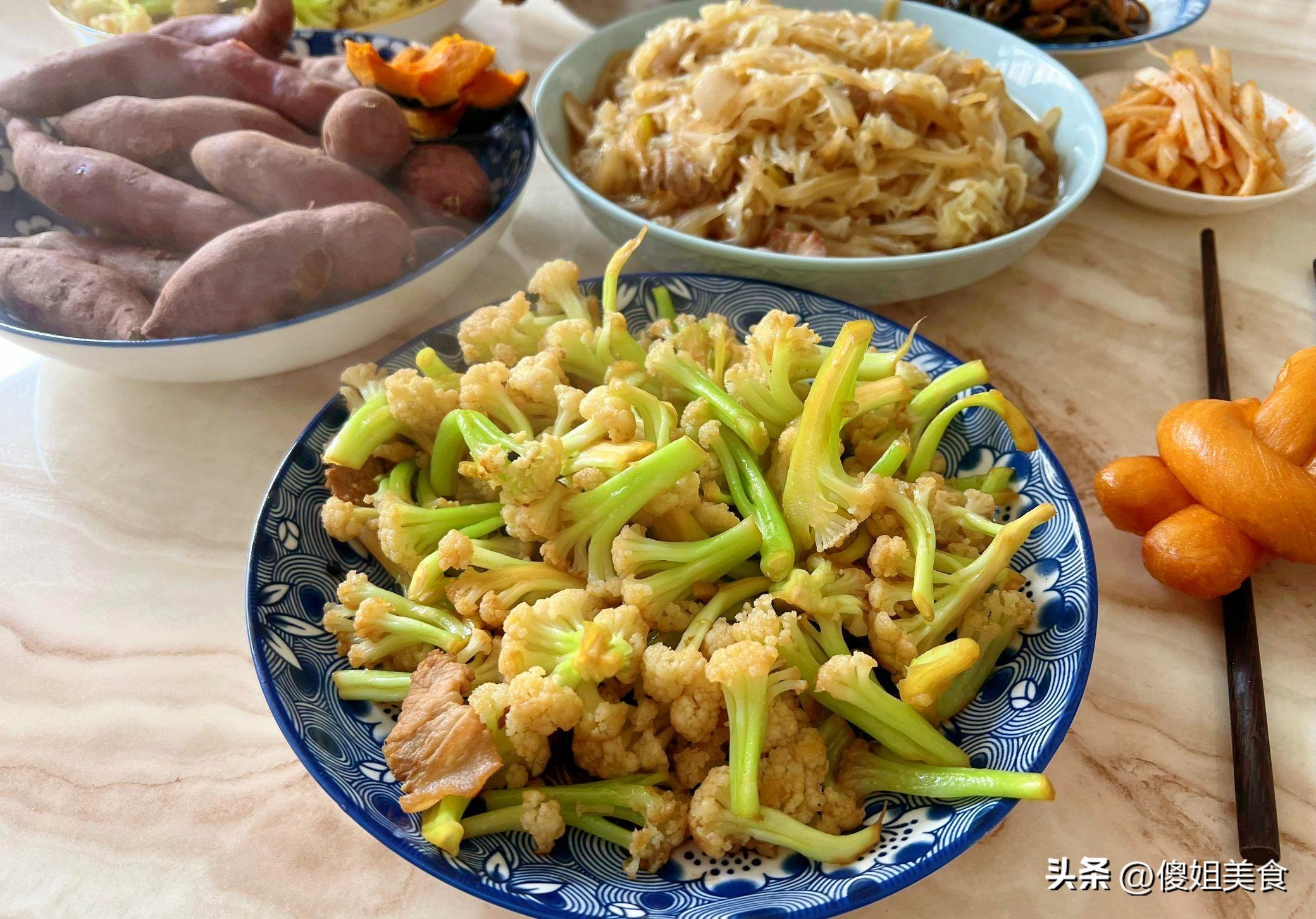 中午就炒個花菜,再來個大白菜燉粉條,主食就喫饅頭和蒸紅薯。小菜有婆婆做的醬油豆,這可是我們當地的特色,別處還真喫不着這味兒。哦對了,還有隻燒雞是鄰居送的,說是去外地帶回來的特產。