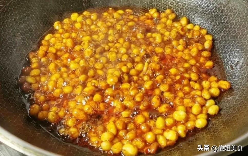 4、這時鍋裏剩下的就是香噴噴的香料油了,把姜蒜末、小米辣放進去炒出香味,然後加入郫縣豆瓣醬炒出紅油。接着把煮好的黃豆放進去,翻炒均勻,讓每一顆黃豆都裹上醬料,然後加入黃豆醬,繼續翻炒。最後倒入一小碗煮黃豆的水,小火慢燉10分鐘,讓黃豆充分吸收醬料的味道,等到湯汁變濃稠,就可以關火了。
