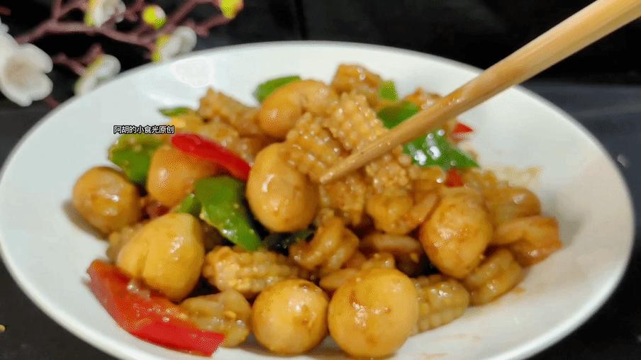 這道炒菜中鵪鶉蛋最好油炸一下,這樣最後更容易掛住湯汁。提前用老抽拌一拌,還可以讓其更快地上色。