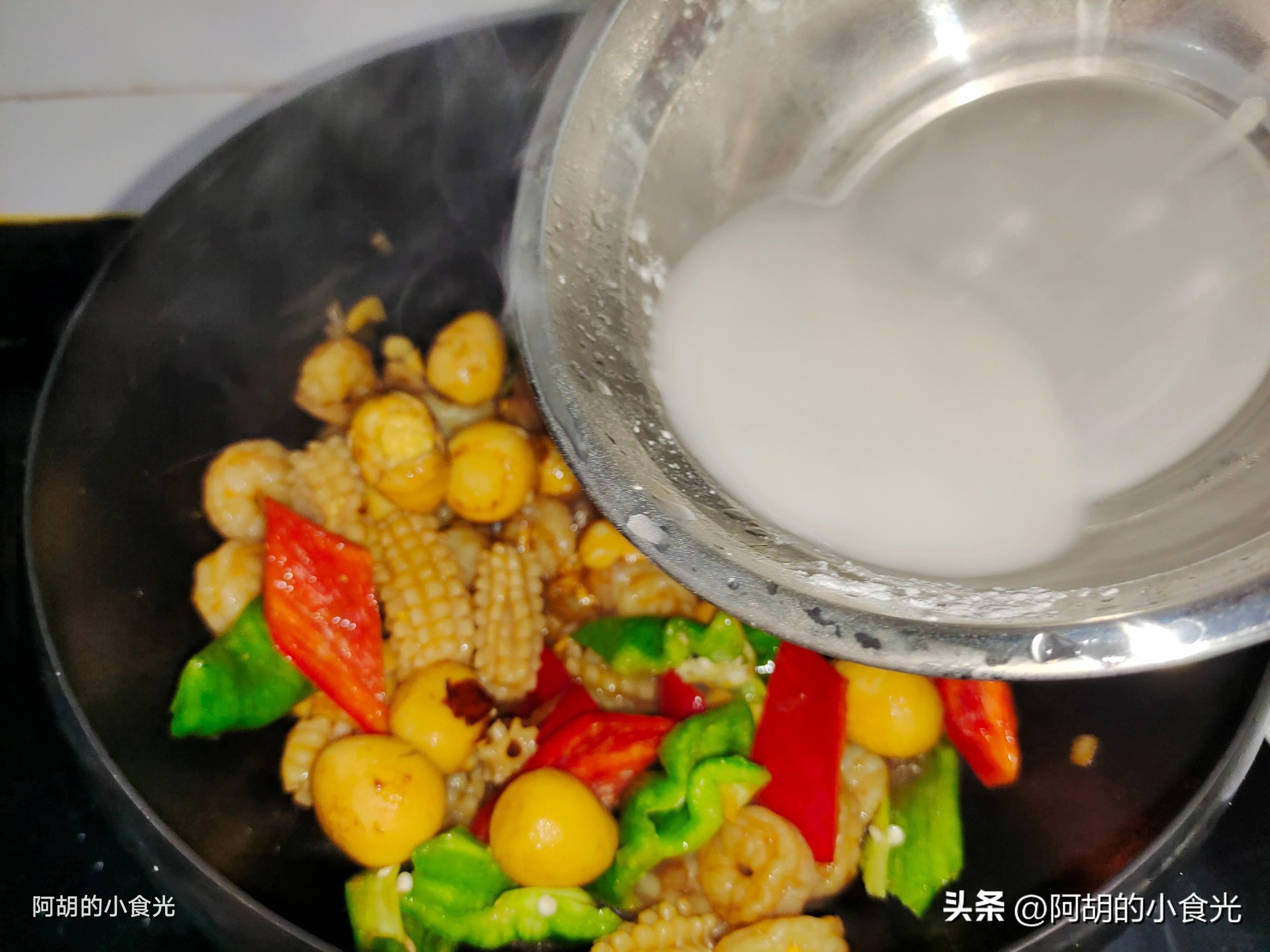 第六步:此時可以把青紅椒塊倒入鍋中,先翻炒均勻激發出椒香味。而後用涼水稀釋一些幹澱粉淋入鍋中,同時鍋內保持大火快速翻炒,讓僅剩的一些湯汁濃稠起來裹住食材,喜歡的也可以再最後淋入少許的芝麻香油炒勻就可以出鍋裝盤了。搭配簡單的一道炒菜,食材豐富又開胃,用來配米飯就好不過了,感興趣的一定要試一試這個做法。