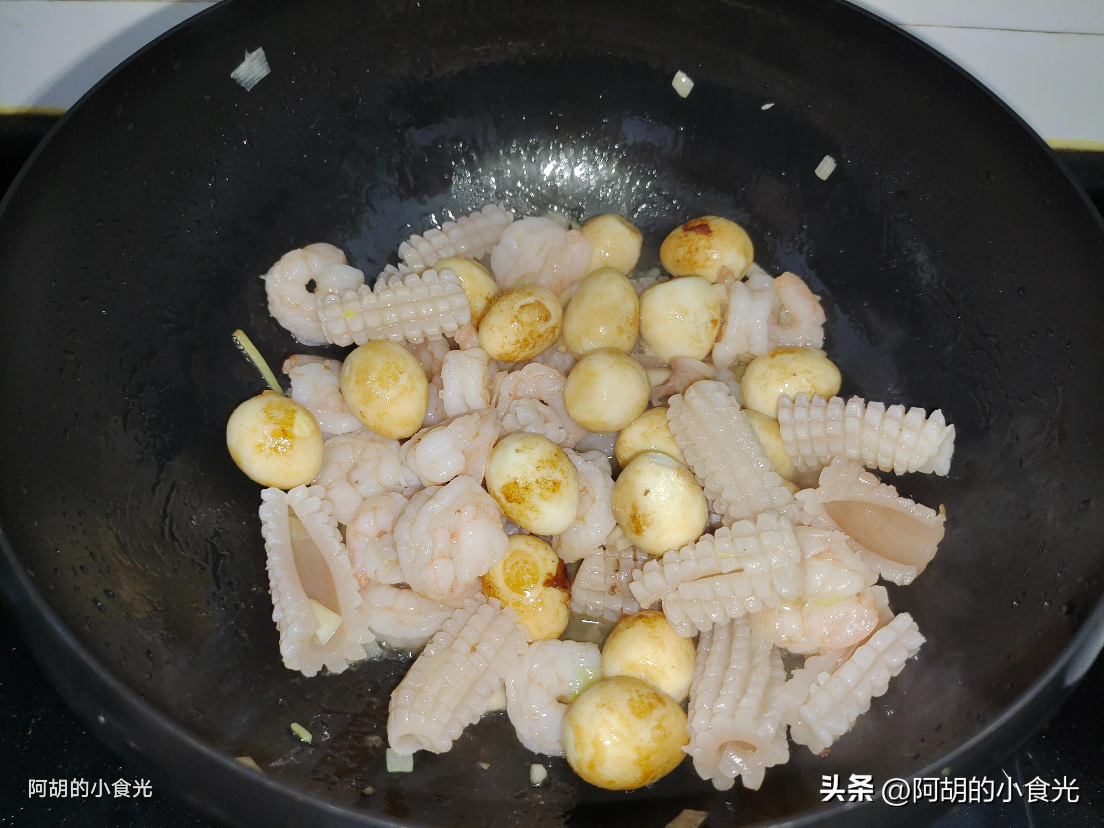 第四步:食材基本都準備好了,下面就可以開火烹飪。先把鍋烘乾水分,再淋入一些花生油小火燒熱,下入小料蔥薑蒜炒出香味,再把蝦仁、魷魚花和鵪鶉蛋一塊倒入鍋中,轉爲大火快速炒一炒,讓食材蒸發掉一些水分,激發出鮮香味。