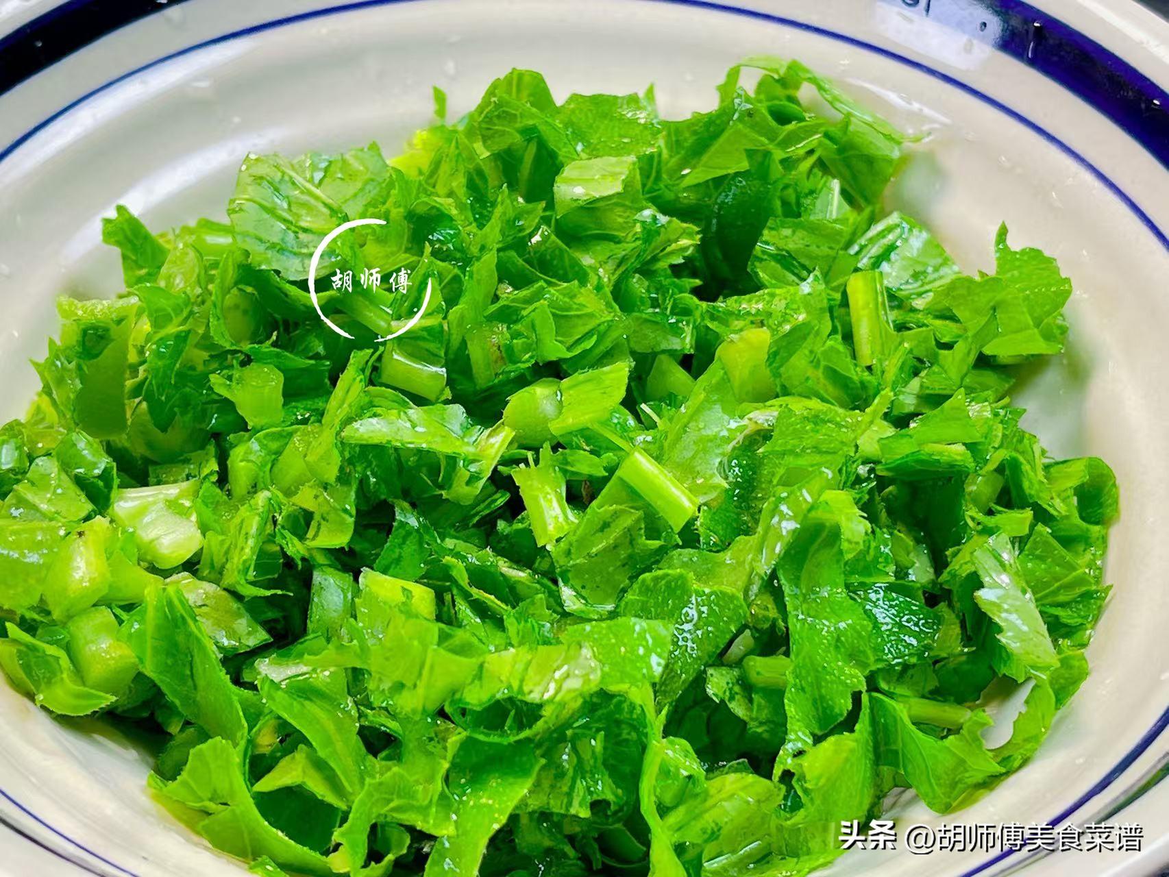 第三步:將蘿蔔葉沖洗乾淨,然後把蘿蔔葉切成小碎步,蘿蔔葉不用鹽殺,殺了的蘿蔔葉反而不太好喫。大家買蘿蔔葉時,儘量買嫩一點,這種蘿蔔葉苦澀味比較輕。