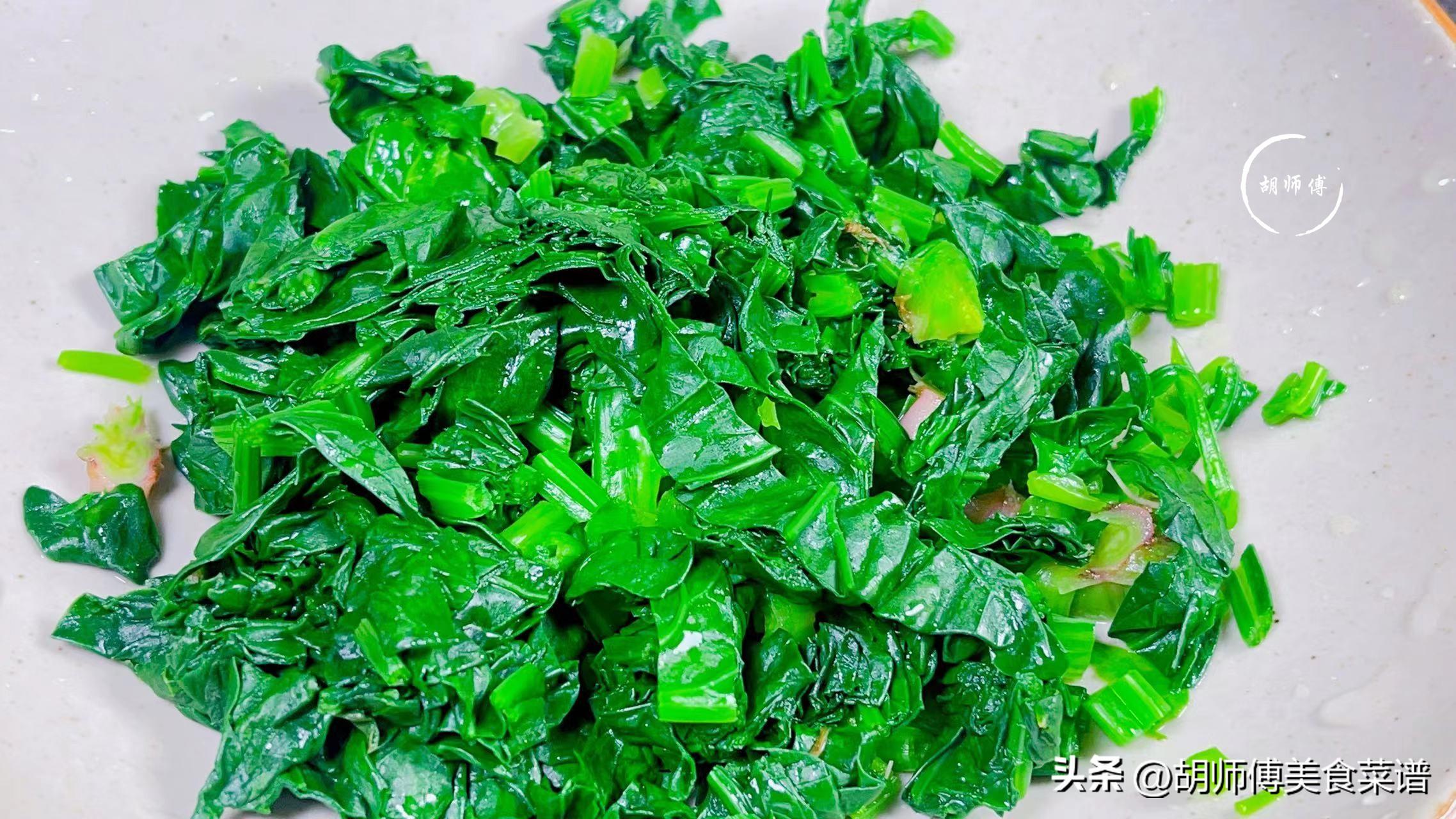 第二步:鍋中放入適量水,等水煮沸後,將菠菜放入鍋中,大火焯水半分鐘後撈出,然後過涼水,等菠菜完全冷卻後即可撈出,接着再用菠菜中的擠幹,把菠菜切成小碎末備用。