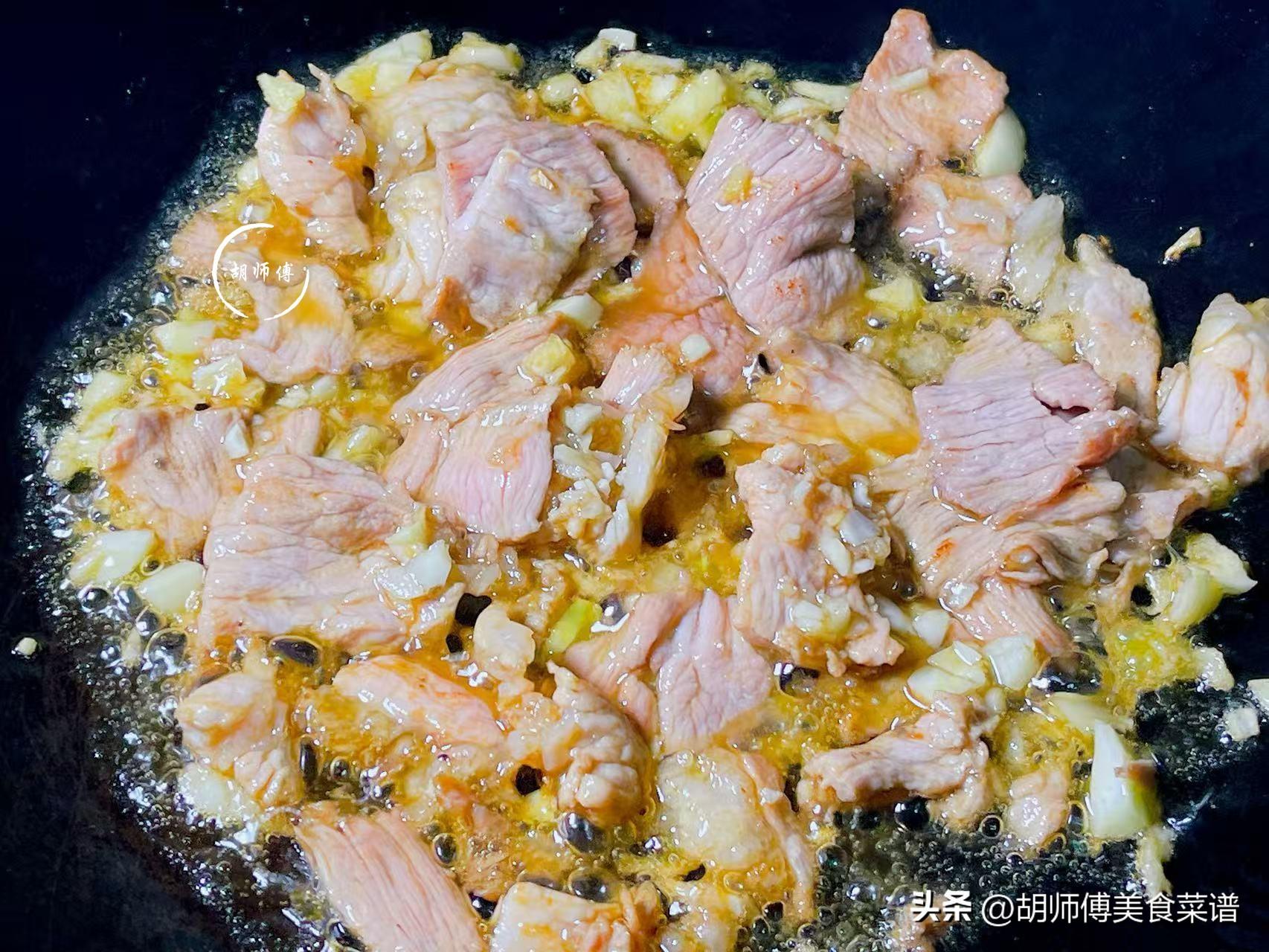 第三步:將鍋燒熱後,放入一勺油到鍋中,等油燒熱後,把油倒出來,再將一勺冷油放入鍋中,大火將油燒熱後,然後把拌好的梅花肉放入鍋中,大火炒半分鐘後,再將薑末、蒜末放入鍋中爆香。