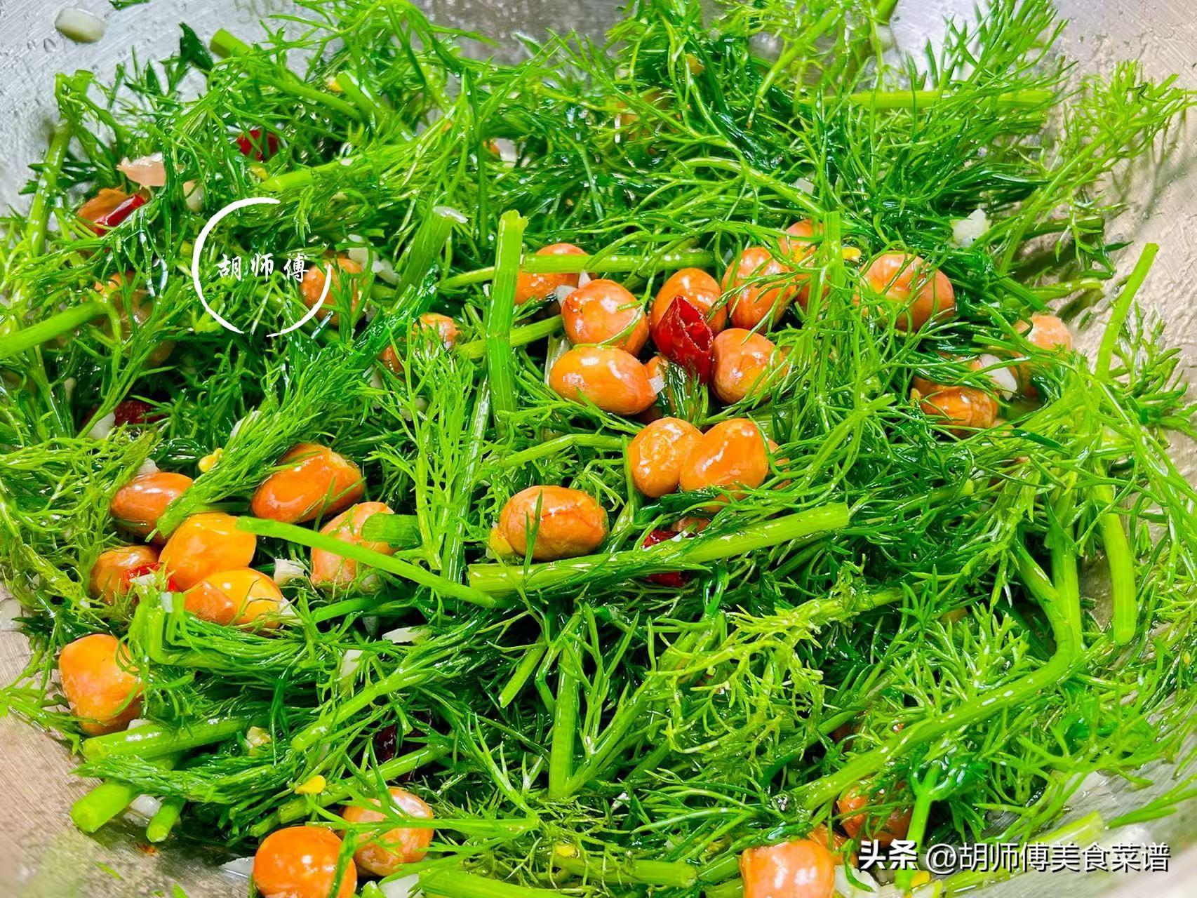 【食材準備】:茴香菜200克、花生150克、大蒜籽10克、幹辣椒5克、陳醋、香油、生抽、食鹽、食用油適量。