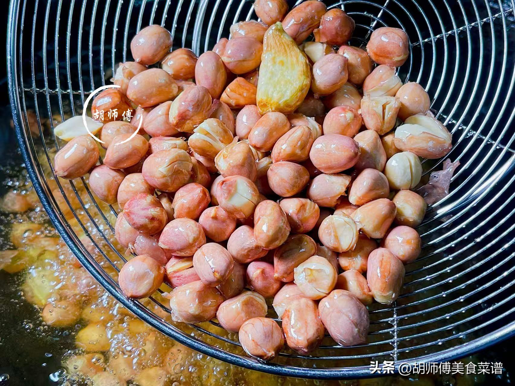 2、炸花生米時,如何判斷花生米如何炸好,只需要放一整顆剝皮的大蒜就可以了,只要大蒜髮黃,就說明花生已經酥脆了,需要立即撈出。