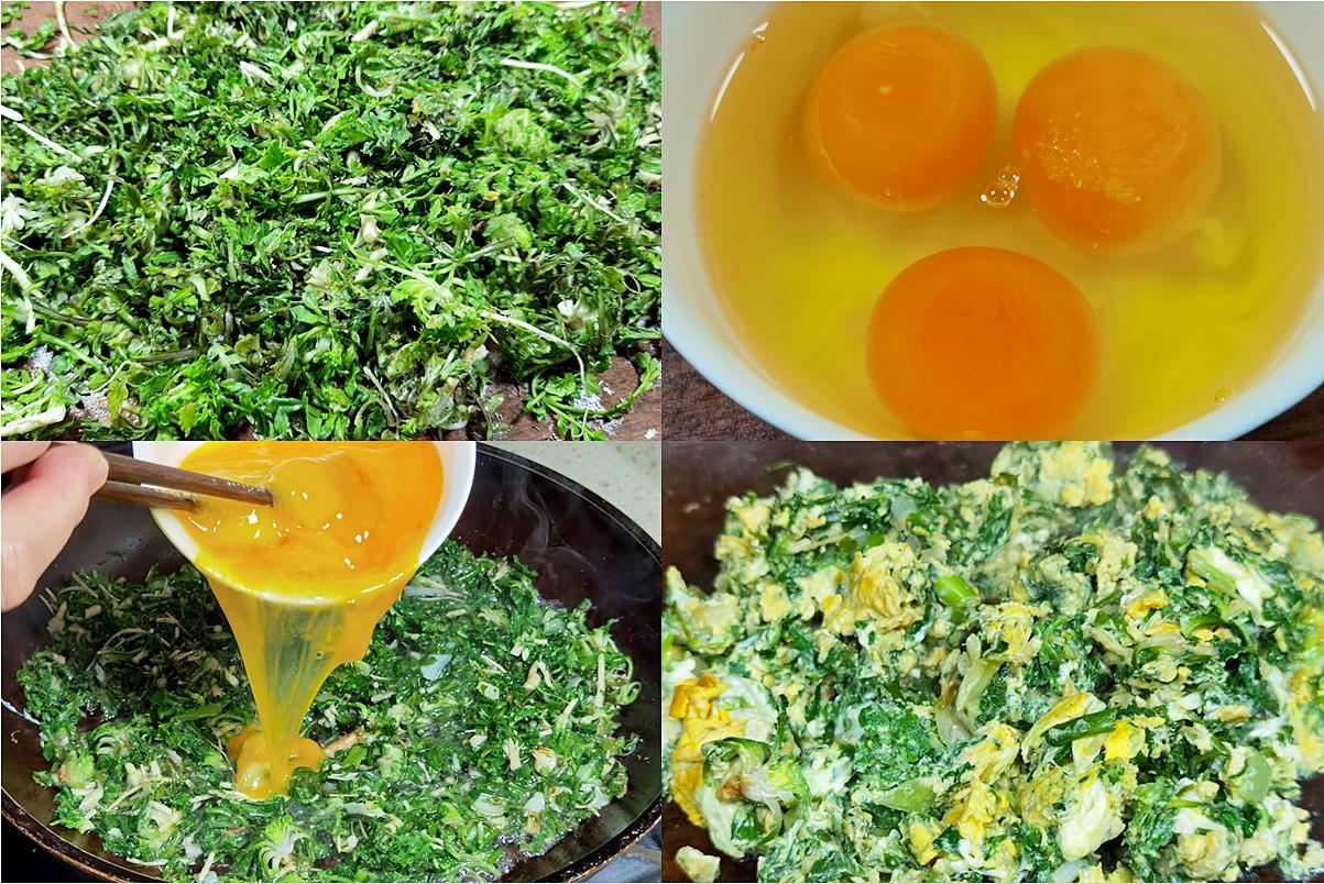 2. 把過涼後的薺菜擠幹多餘水分(稍微用點力,越幹越好),然後切成碎末。碗裏打入3-4個雞蛋,加適量鹽,用筷子攪打均勻。
