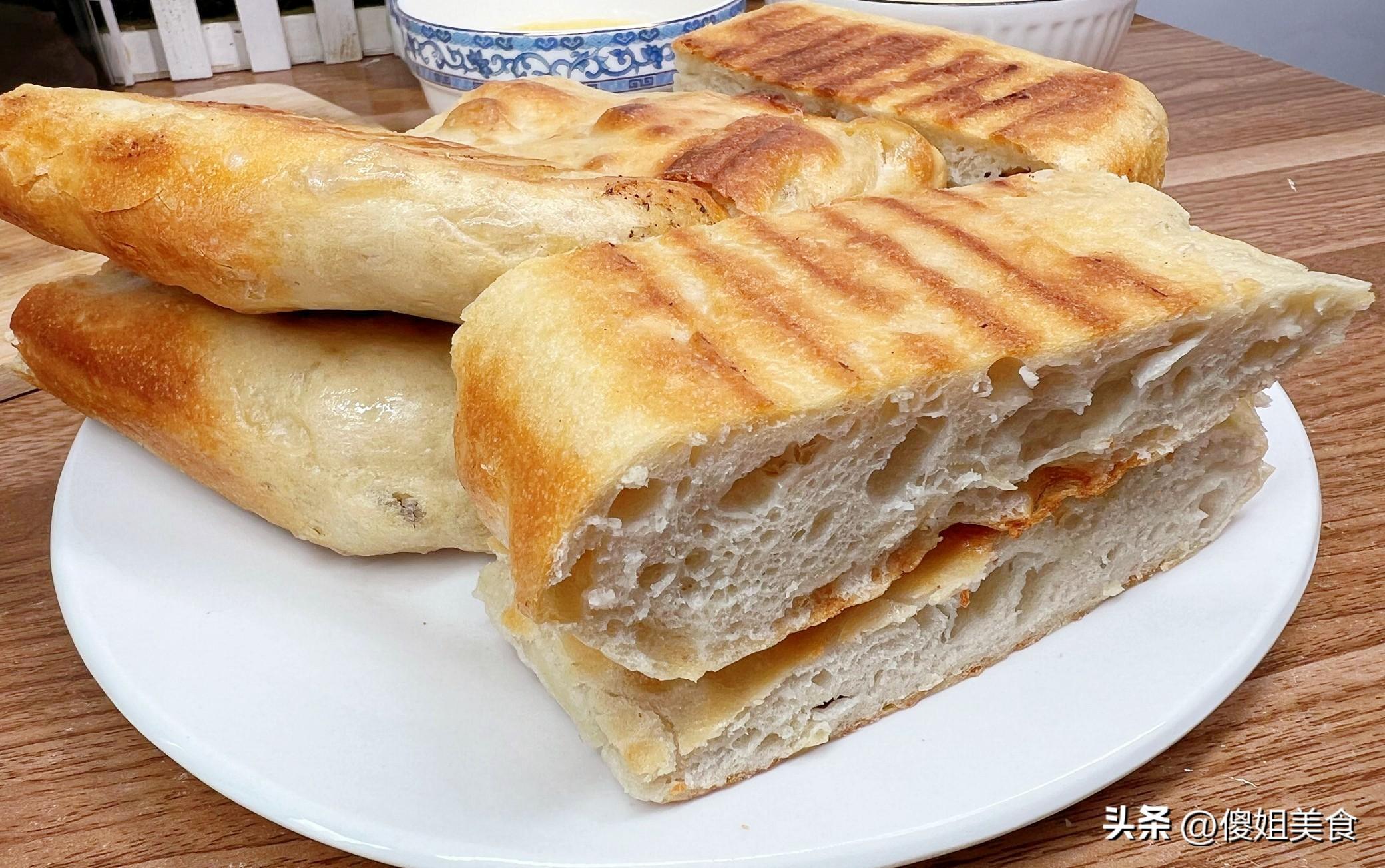 婆婆烙的發麪餅外酥裏軟,層次分明。她是用老面發的,頭天晚上和好面,第二天早上剛好。把發好的面揉一揉,擀成大片,刷上一層油,撒上少許鹽和乾麪粉,然後捲起來分成劑子,再把每個劑子擀成餅狀,放入預熱的餅鐺中,烙到兩面金黃就可以了。