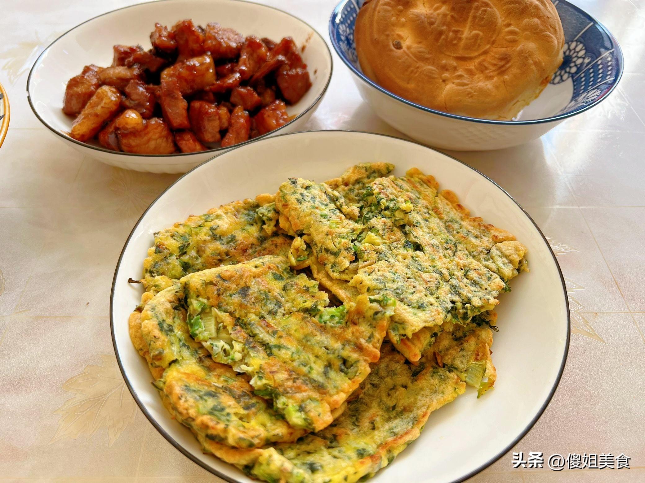 平底鍋燒熱,刷一層薄油,舀一勺麪糊倒入鍋中,用勺子背輕輕攤開,聽着“滋啦”一聲,香味立刻就冒出來了。小火慢煎,等到一面定型,翻個面,煎到兩面金黃就可以出鍋了。我一連烙了四張,一張摞一張,金黃翠綠相間,看着就有食慾。
