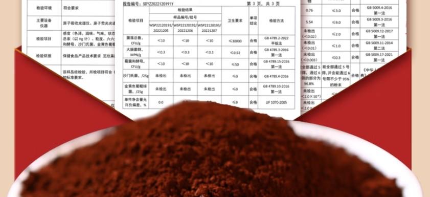 該產品使用紫晶色玻璃瓶作爲容器,配以電鍍金屬瓶蓋。孢子粉整體爲深栗色,粉末顆粒均勻,流動性佳。其原料來源於伏牛山區的仿野生栽培基地,生長週期較長。破壁工藝注重控制溫度,以避免高溫對成分可能造成的影響。瓶身背面貼有詳細的產品信息標籤,包括生產日期與產地編碼。粉末在水中的分散性良好,部分微小顆粒會懸浮於水中。