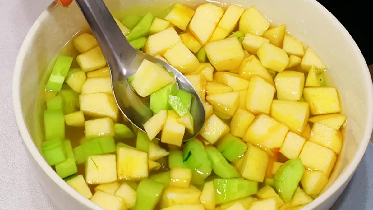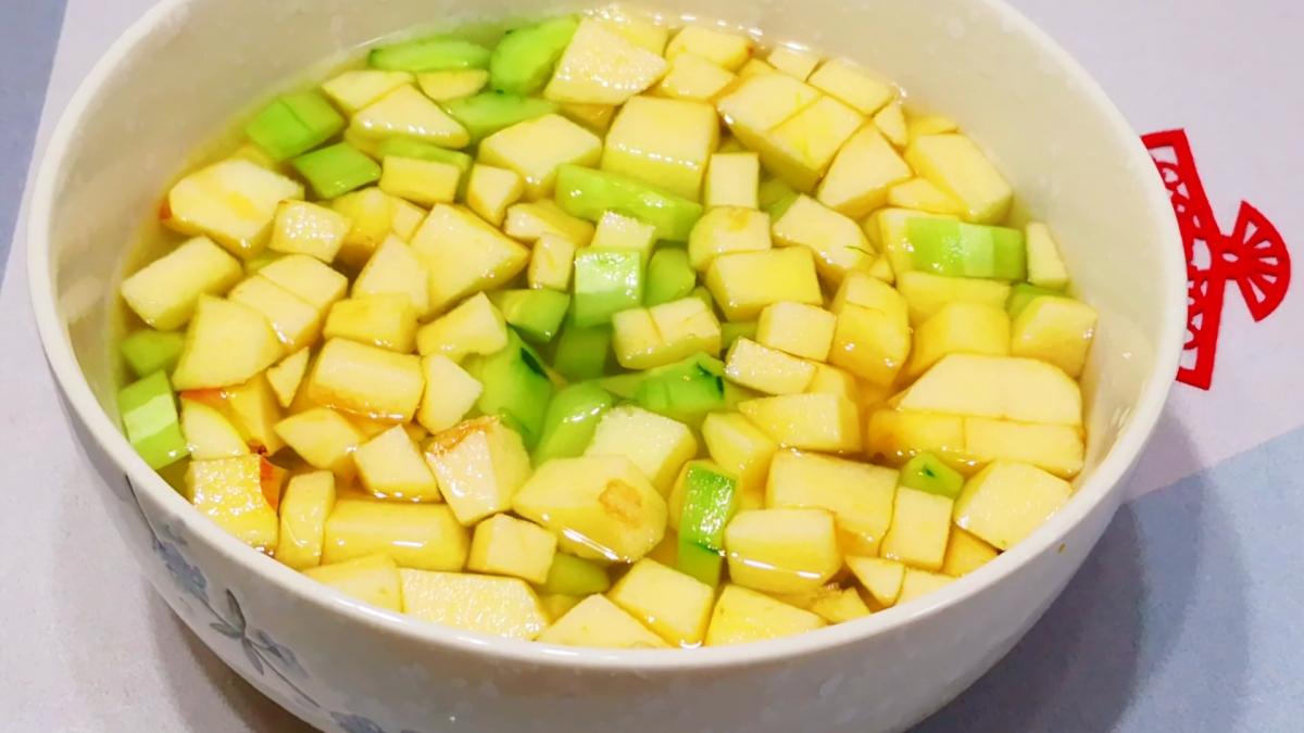 蘋果煮熟後果膠更容易吸收,能保護胃黏膜;黃瓜煮熟後寒性降低,減少對腸胃的刺激,兩煮搭配一起煮,補水潤燥,營養更均衡,喫起來口感軟爛,胃不好的朋友喫着也無負擔,還能促進消化,緩解胃脹。