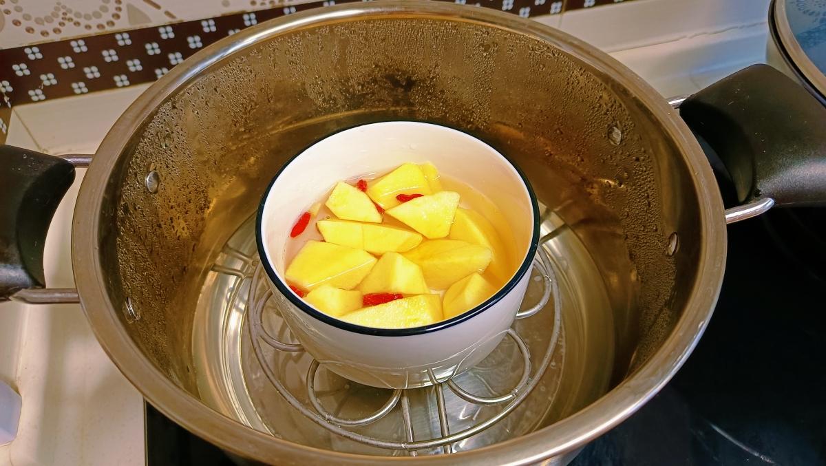 4.蒸鍋中加水燒開,將裝有蘋果的蒸碗放入,蓋上鍋蓋,中火蒸15分鐘左右(蘋果的質地較硬,蒸夠時間才能軟爛,腸胃敏感的朋友可以多蒸上2~3分鐘)