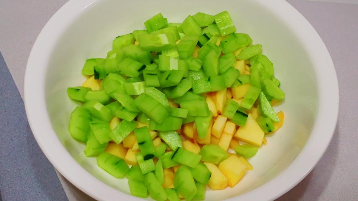 2.黃瓜去掉表皮後,再去掉中間的瓤,然後切成和蘋果差不多大小的塊。