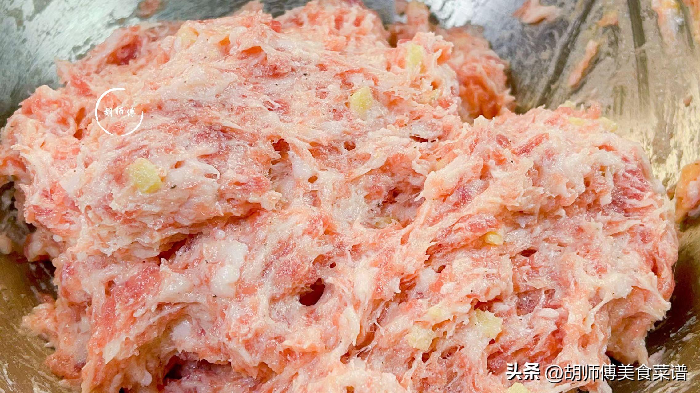 第三步:把前夾肉去皮後洗淨,然後將肉剁成碎末後放入碗中,接着再把雞蛋、澱粉、食鹽、雞精、胡椒粉放入碗中,快速攪拌肉餡,大概朝一個方向攪拌10分鐘左右,肉就非常有勁,這樣做出來的肉丸,喫着會很有彈性。