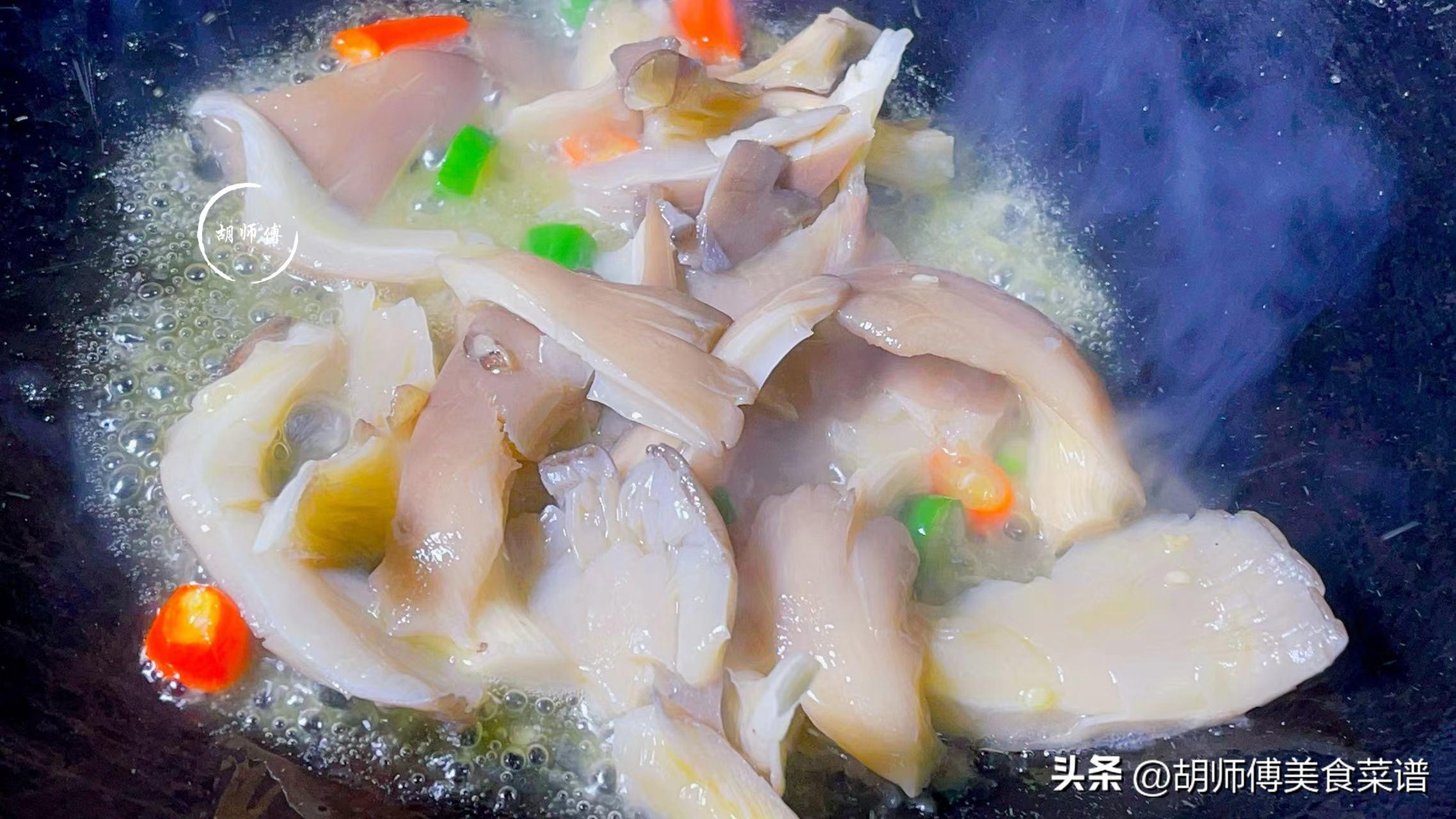 第七步:另起一個鍋,放入一勺油到鍋中,等油燒熱後,將平菇、青紅椒放入鍋中,大火將它們炒半分鐘,將平菇炒一下,可以使燉好的湯喝着更鮮。