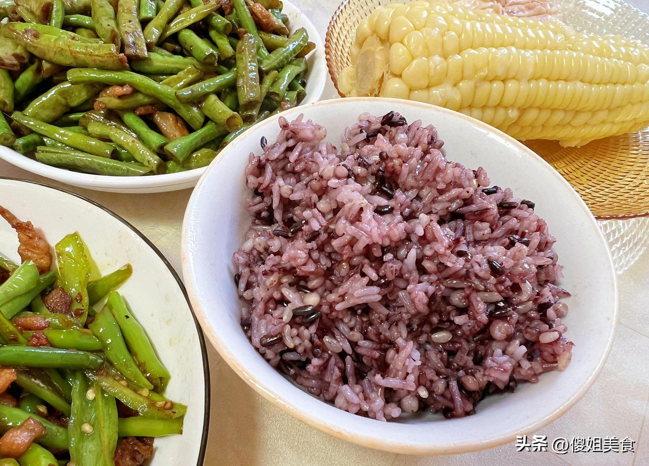 今天的主食是黑米飯,我媽說黑米營養好,他們經常喫。黑米和白米一起蒸,米飯透着淡淡的紫色,看着就很有食慾。喫起來軟糯香甜,還有一股特殊的穀物香氣。