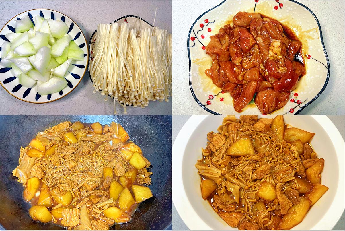 這道燉菜堪稱“冬季暖胃擔當”。冬瓜軟糯,腐竹吸飽了湯汁,金針菇提鮮,而裏脊肉則提供了紮實的肉感。整個湯清甜不油膩,營養全面,非常適合老人和孩子。