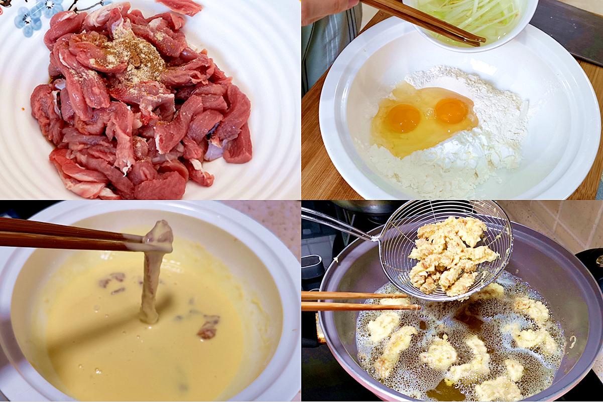 3. 把醃好的肉條放入麪糊中,均勻地掛上一層面衣。