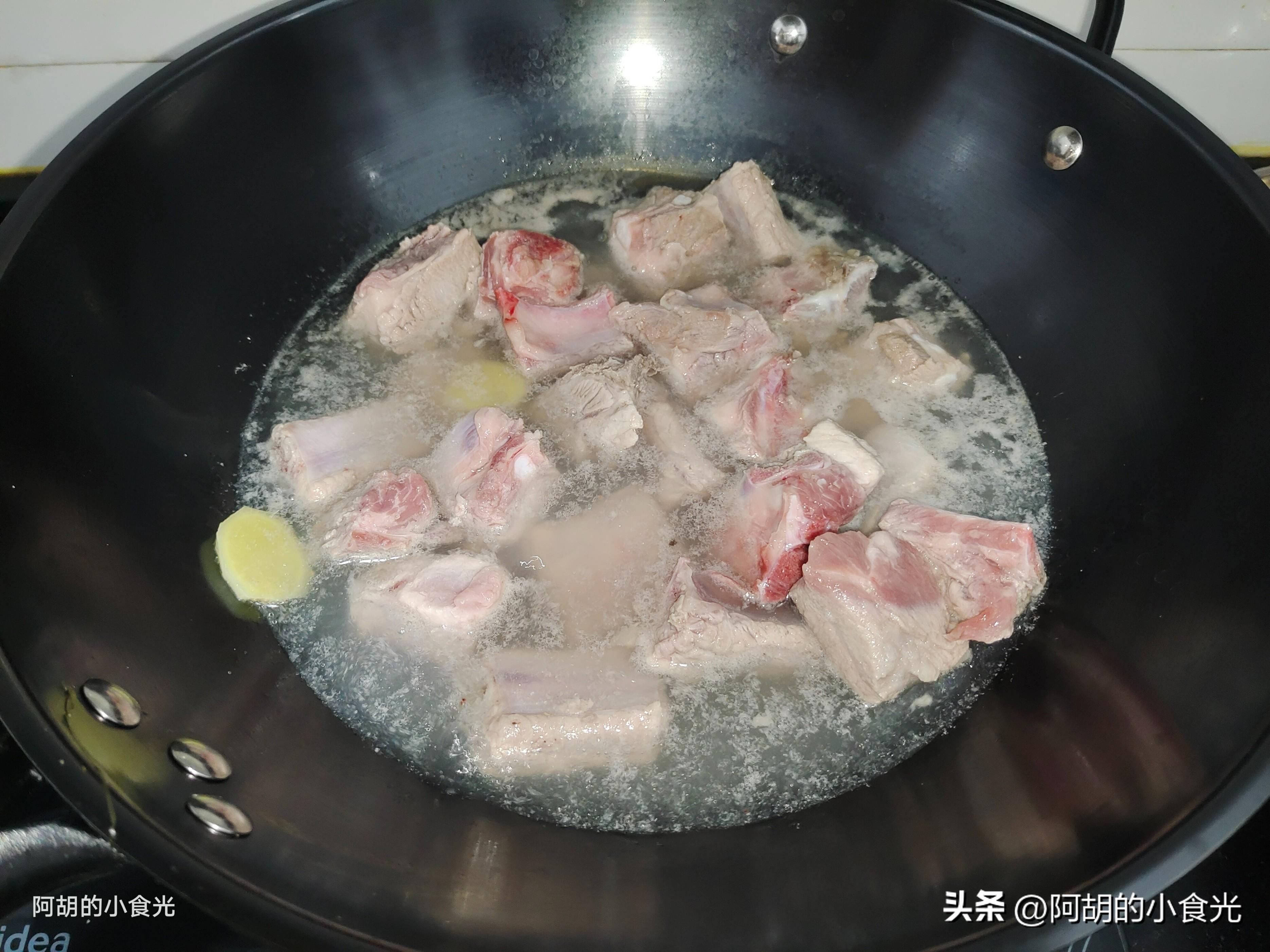 第一步:先來處理排骨部分,兩根排骨斬塊後先丟入涼水中泡一泡,幫助泡出一些血水,撈出後再涼水下鍋,加入一些薑片和料酒大火開始焯水,水開後再煮個三五分鐘就可以撈出來,撈出來的排骨記住還要用溫水衝一衝,防止表面沾染一些血沫。