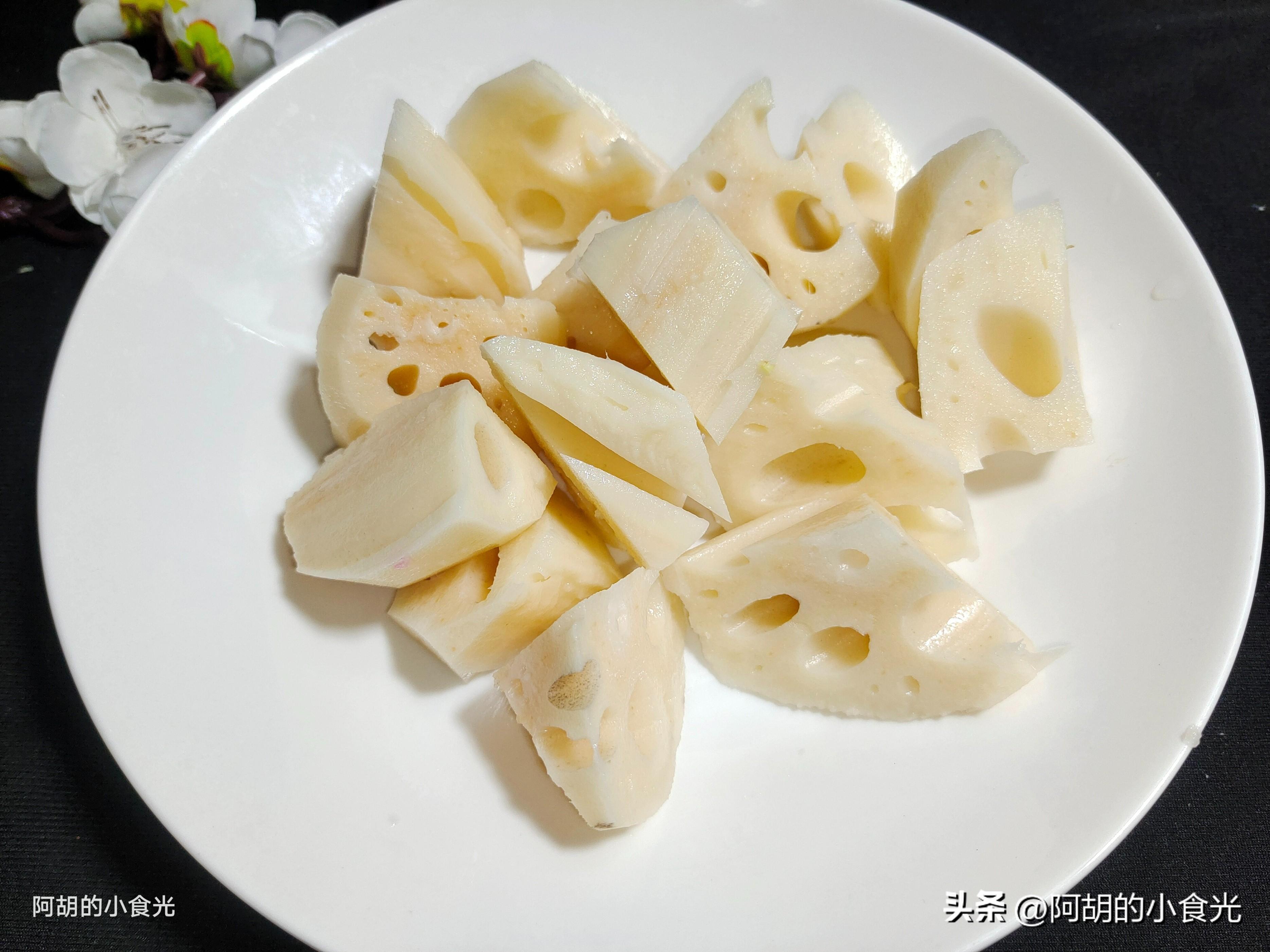 第二步:準備的配菜也比較簡單,其一就是蓮藕了,去皮後直接斬切成大塊,而後丟入涼水中,淋入一些白醋攪勻就這樣浸泡着,防止其變色。再有一些海帶結洗淨後備用,或者也可以用那種比較厚的海帶片,一把幹黃豆泡發後待用,一些蔥姜備用。